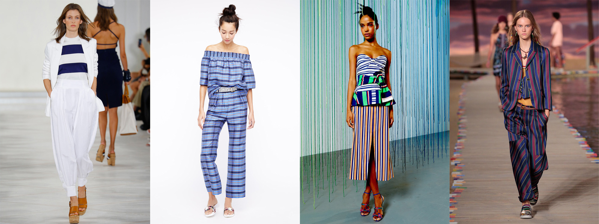 Полоски streifen Слева направо: Ralph Lauren, Tanya Taylor, J.Crew и Tommy Hilfiger Нет, речь вовсе не о морской тематике! Ведь полоски могут быть не только синими. В то время как Ralph Lauren хранит верность однажды выбранному стилю, молодой дизайнер Tanya Taylor демонстрирует яркие принты и сложные фасоны. Фавориты сезона: стильные топы с открытыми плечами и брюки клеш от J.Crew. А Tommy Hilfiger представил стильный костюм-двойку в полоску фирменных цветов – синего и красного.   Короткий топ crop Слева направо: Diesel, Thomas Wylde, Vera Wang Тренд, актуальный в 90-е, обрел второе дыхание, и следующим летом мы снова сможем порадовать себя разнообразными короткими топами. Но в сезоне весна-лето 2016 эта деталь гардероба предстанет в новом свете. Актуально: Diesel делает ставку на кожаные топы в рокерском стиле, а Vera Wang и Thomas Wylde используют короткие топы как основу, сочетая их с длинными платьями и шортами с завышенной талией.   Неоромантика Blumen Слева направо: Delopozo, Michael Kors, Coach Да здравствуют цветы! Как и в каждом сезоне, летом 2016 года не обойтись без цветочных принтов и ярких аппликаций. В коллекции Delpozo эти тенденции воплотились в длинных жилетах, а коллекция Coach продемонстрировала движение в направлении стиля «хиппи-шик».   Лето в белом weiß Слева направо: DKNY, Carolina Herrera, Proenza Schouler, Thomas Wylde Разве можно представить себе лето без нежных белоснежных нарядов? Минималистичный дизайн от DKNY соперничает здесь с асимметричным покроем и легкими материалами платьев и блузок, комбинируемых с юбками средней длины, представленных Proenza Schouler и Caroline Herrera. Главный акцент коллекции Thomas Wylde – полупрозрачные блузки в сочетании с женственным блейзером с кожаными отворотами.   Пижамный стиль pyjama Слева направо: Calvin Klein, Givenchy and Alexander Wang В последние сезоны этот стиль почти не давал о себе знать, но следующим летом он снова будет чрезвычайно актуален. Шелковые платья и легкие накидки в форме купального халата обязательно должны появиться в летнем гардеробе каждой модницы.   Оранжевый orange Слева направо: Altuzarra, Lacoste, Prabal Gurung В тренде – яркие цвета! В коллекциях таких дизайнеров, как Altuzarra, Lacoste и Prabal Gurung, все вращается вокруг одного цвета: оранжевого! Color blocking? Вчерашний день! Самый актуальный цвет нового сезона лучше ни с чем не смешивать.   Рюши rüschen-1 Слева направо: Proenza Schouler, Marchesa, Tome Мечта многих девушек – рюши во всей их красе – были представлены в коллекции Marchesa. Proenza Schouler и Tome продемонстрировали длинные платья с узкими поясами и блузки сложного дизайна с глубоким декольте.