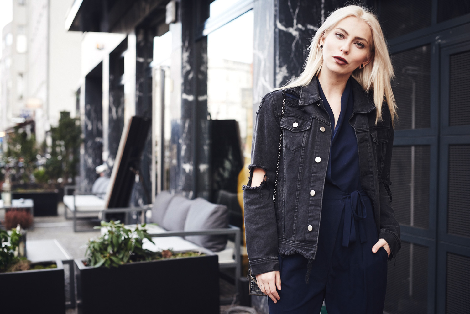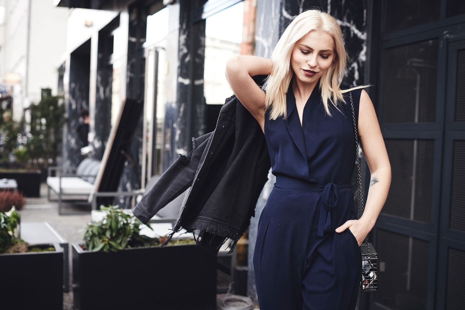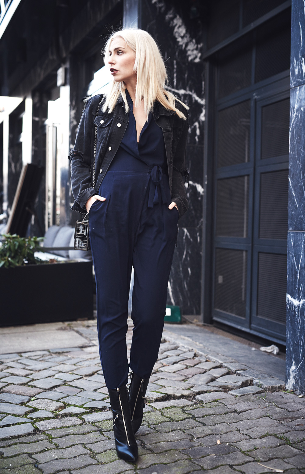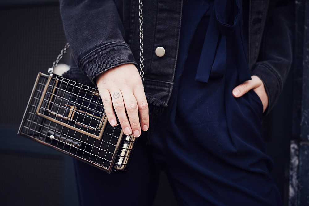 Последние мои образы были довольно простыми, а сегодня я снова хочу показать вам элегантный образ с темно-синим комбинезоном. Чтобы наряд выглядел не слишком пафосно, я дополнила его ботильонами и черной джинсовой курткой, которую я обнаружила в своих вещах при переезде и заново в нее влюбилась. Мне кажется, что за счет этой куртки образ выглядит еще более стильно.