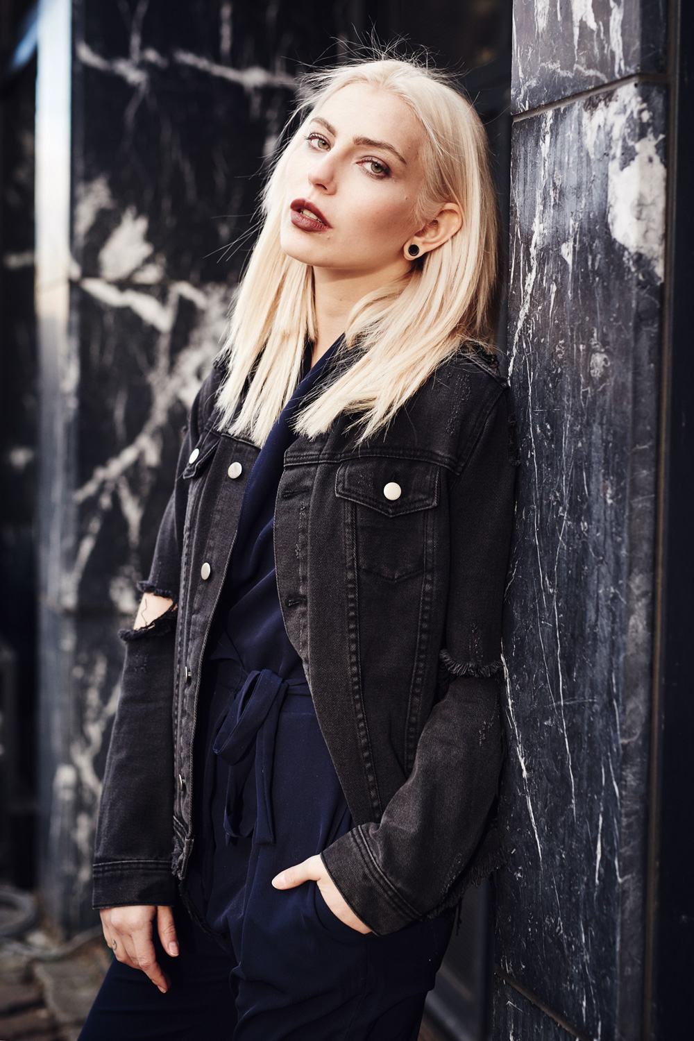 Nachdem die letzten Looks eher schlichter waren, gibt es heute wieder einen schickeren Look mit einen nachtblauen Jumpsuit. Damit das Outfit nicht zuuu schick wird kombiniere ich es mit Ankle Boots, die ein echtes Highlight abgeben und einer schwarzen Jeansjacke, die ich seit Ewigkeiten besitze und die jedes Outfit grungiger macht. Ich habe sie beim Umzug quasi wiederentdeckt und mich neu verliebt und dachte, das macht das ganze Outfit ein bisschen mehr edgy.