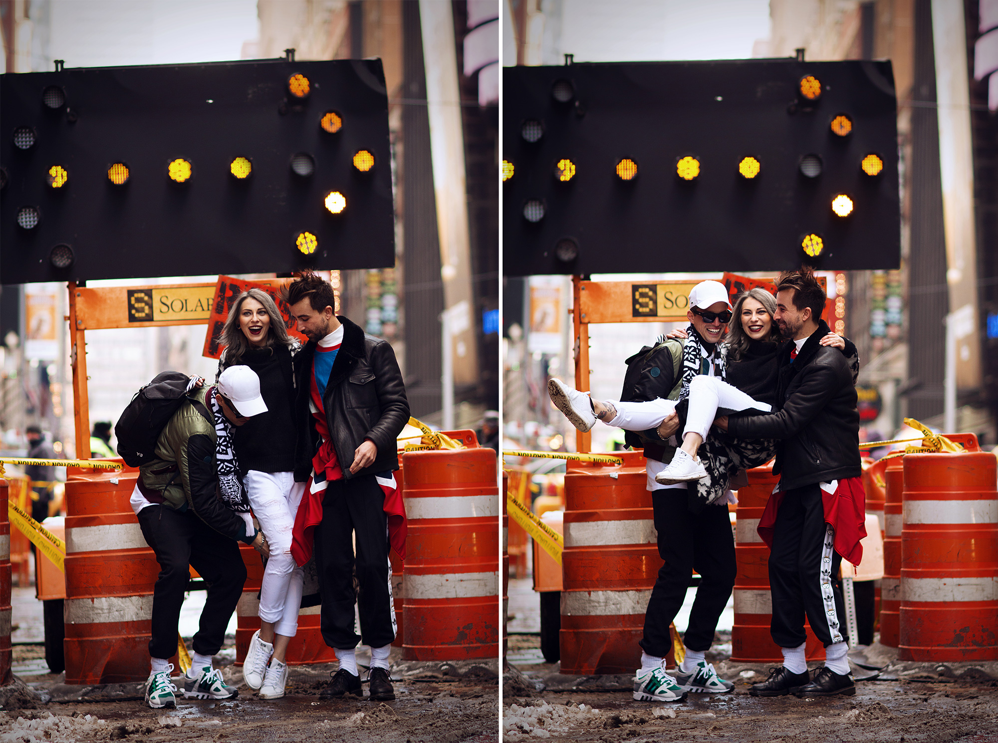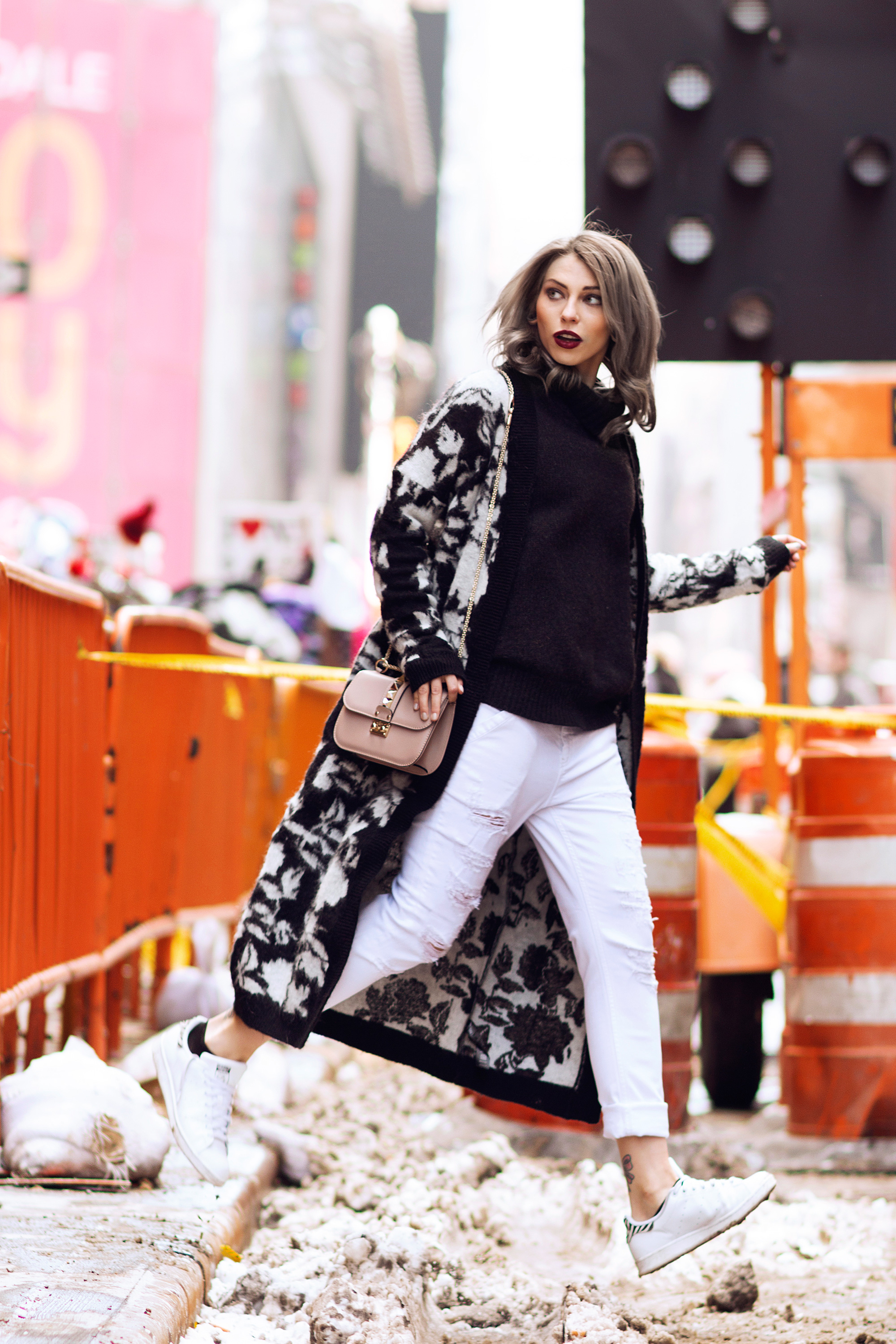 Mein Montagslook ist heute ein bisschen sportlicher als üblich und auch wärmer! Die Boyfriend Jeans von Mavi (kommt bald in die Läden!) gibt dem ganzen Look etwas frühlingshaftes und leichtes. Generell ist das Outfit sehr basic-lastig und sportlich, was ich zur Abwechslung auch mal ganz nett finde und was ziemlich gut nach New York passt, wo man eh viel zu Fuss unterwegs ist. Ehrlichgesagt bevor ich diese Jeans anprobiert habe, waren weisse Jeans bisher ein absolutes No-go für mich, aber ich in dieser Kombination finde ich sie ziemlich klasse und dieses oversized-destroyed Ding ist ja eh voll meins! Was sagt ihr?   Übrigens: manchmal kann New York ziemlich klein sein! Während wir nämlich Bilder geschossen haben, wunderte ich mich welche Nervensägen da an der Seite Faxen und Fotos machen, schaue zur Seite und sehe…die Dandys! Stehe die da einfach und beobachten mich! Und weil das so nicht geht, musste ich sie direkt mit aufs Bild holen, klar! Ehrensache :) Today’s outfit is warmer and sportier than the last ones, but very basic, which I like. Especially in New York, where you go by foot a lot.   By the way: Look who I’ve met! The Dandys! New York can be so small sometimes!