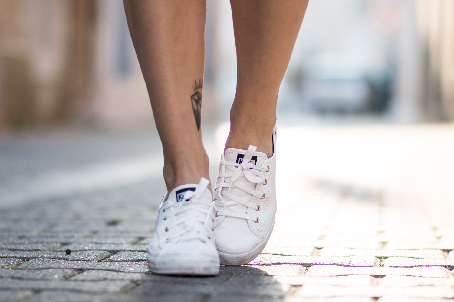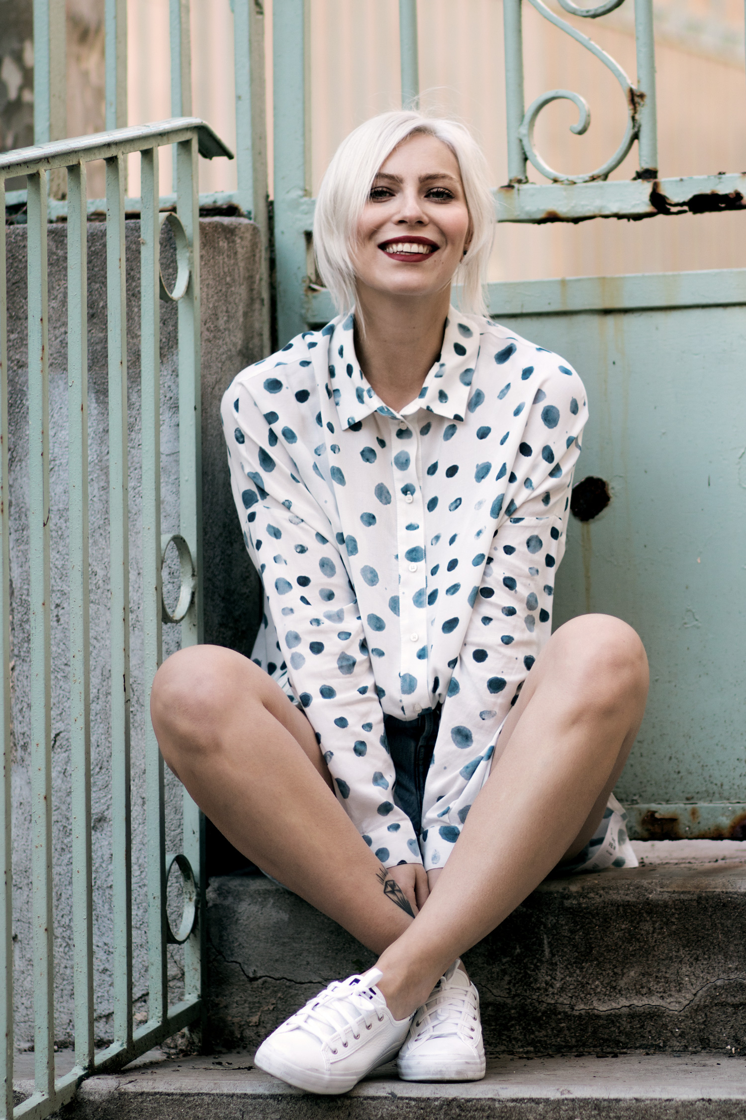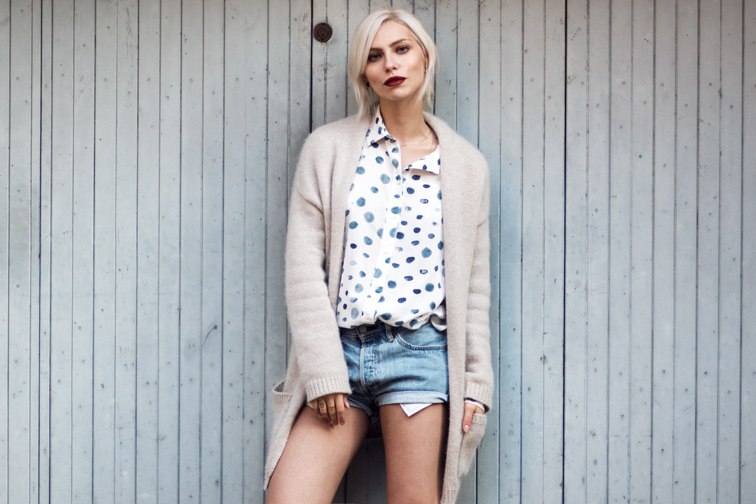 The Look dots shirt | 5Preview DIY shorts | Levi’s white sneaker | Keds cashmere cardigan | Strenesse