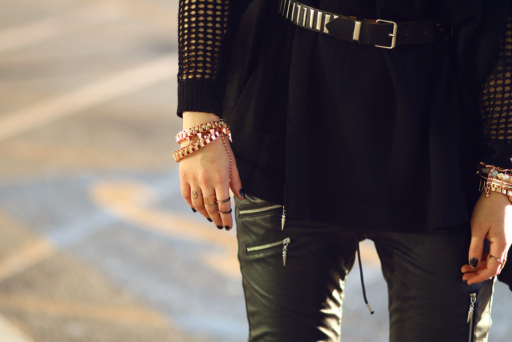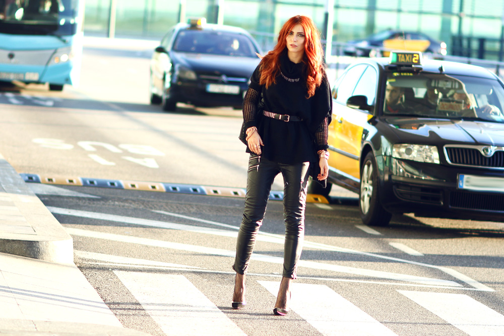 Der heutige Look ist ziemlich spontan am Flughafen von Barcelona entstanden, wo ich noch zu Jana meinte „Das wäre doch eine echt coole Location…“ und zack, hab’ ich andere Schuhe angezogen und Jana gezwungen Bilder zu machen. Ich hatte das Outfit am letzten Tag in Barcelona an und fand es eigentlich ganz gut gelungen, sodass ich die Idee davon Bilder zu machen alles andere als abwegig fand. Die Lederhose ist mittlerweile ein bisschen ausgeleiert, dafür aber umso bequemer und der Rolli ersetzt einen Schal und hält auch bei ekliger Flugzeugluft schön warm – praktisch also :)   Ansonsten trage ich auf dem Bild meine aktuelle Lieblingstasche mit der man mich fast jeden Tag sieht aus ganz glänzendem Leder mit einigen schwarzen Nieten drauf. Das gute an ihr: sie ist wirklich zu allem kombinierbar und es passt vieeeel rein. Zumindest genug, dass ich all meinen Reisekram reinbekomme mit Macbook, Zeitschriften und alles was insgesamt gefühlte 100 kg wiegt. Alles in einem ein praktischer, aber dennoch stylischer Lieblingslook.   Today’s outfit was shot spontaneously at the airport, where I first thought: „oh that’s a good location…” and in the next second I asked Jana to take some pictures so here is the result. It was my last day in Barcelona where I wore this comfy jumper and my favorite bag, that has enough space for all my stuff. All in all it’s a convenient, but still stylish look :)