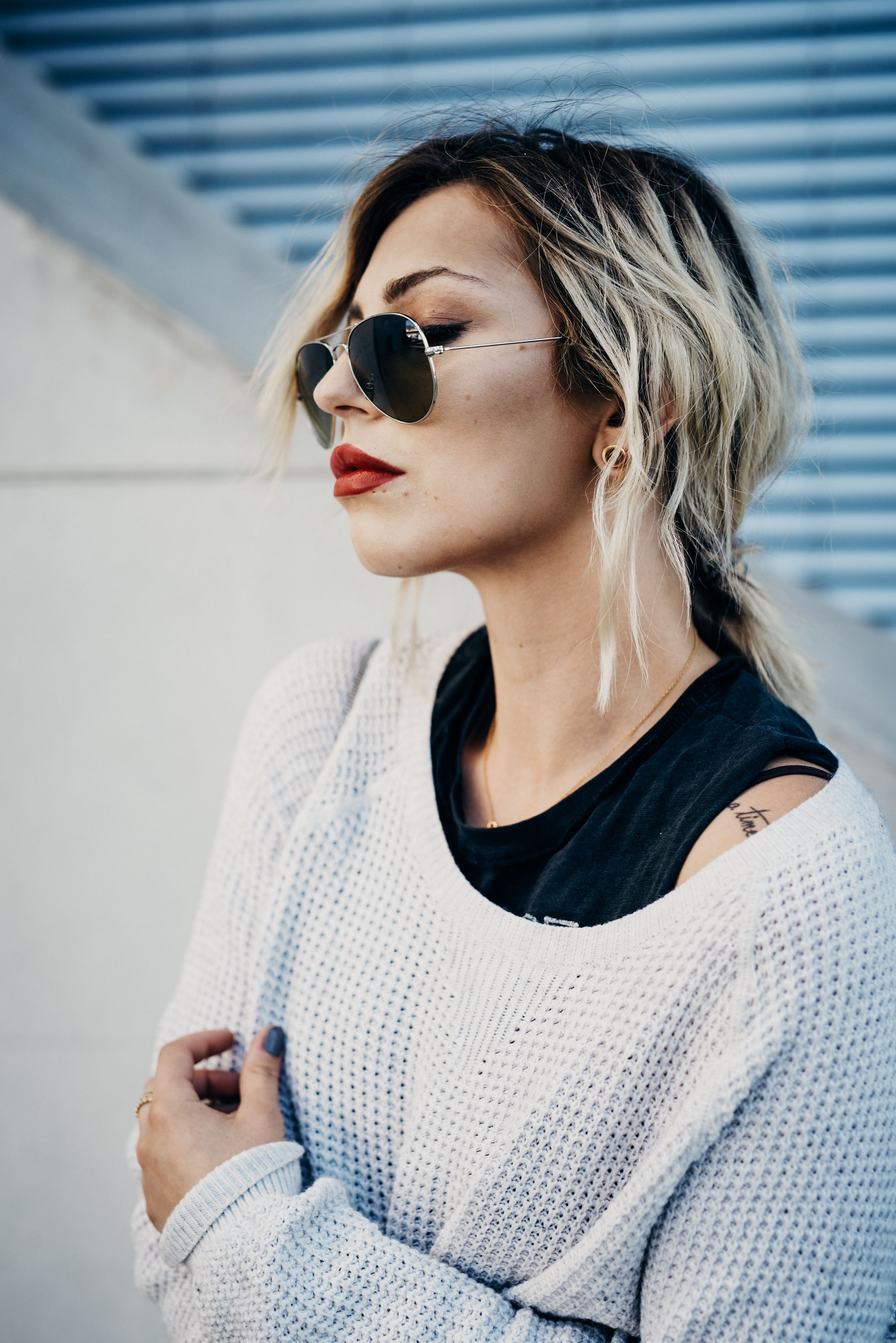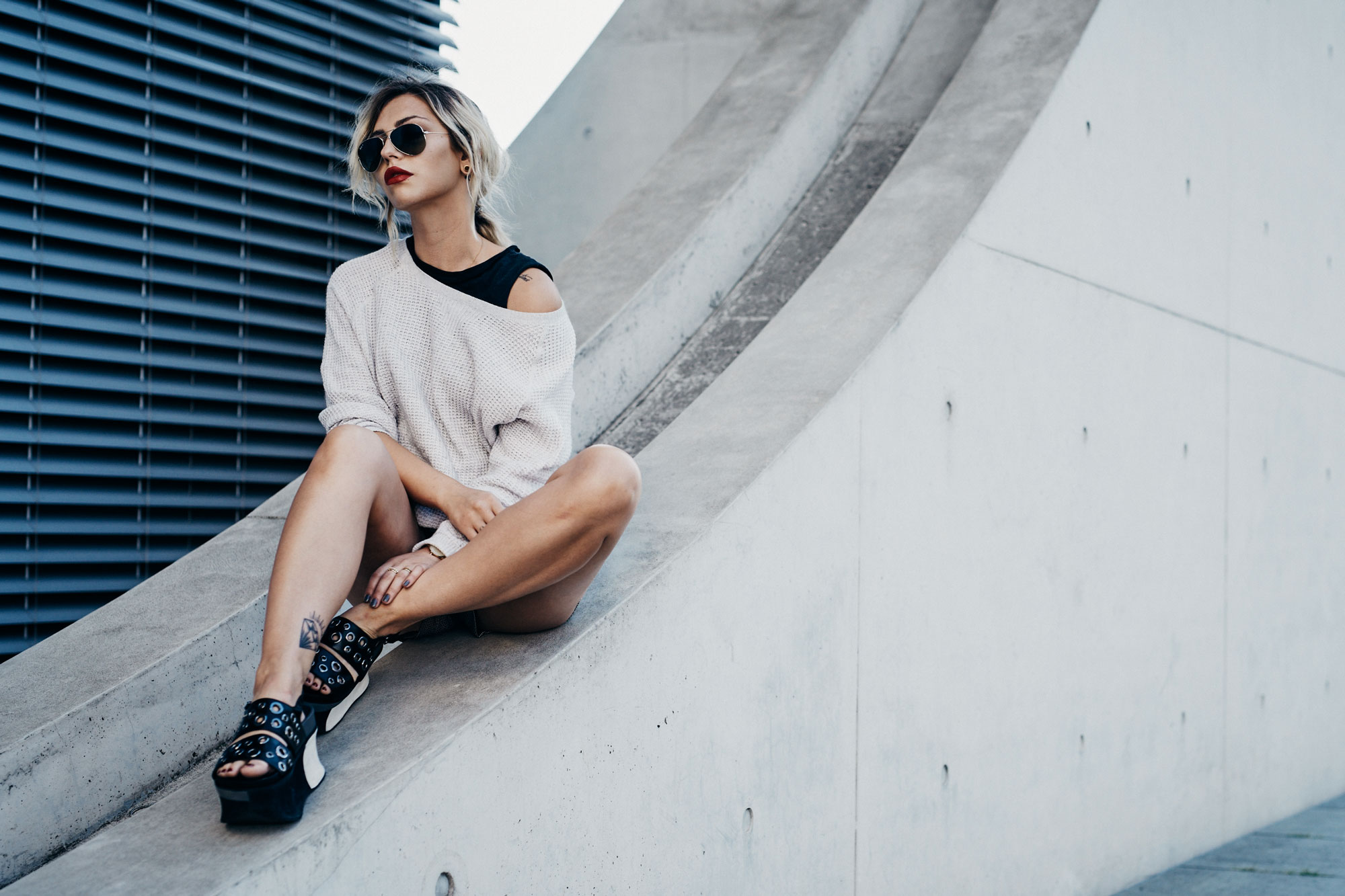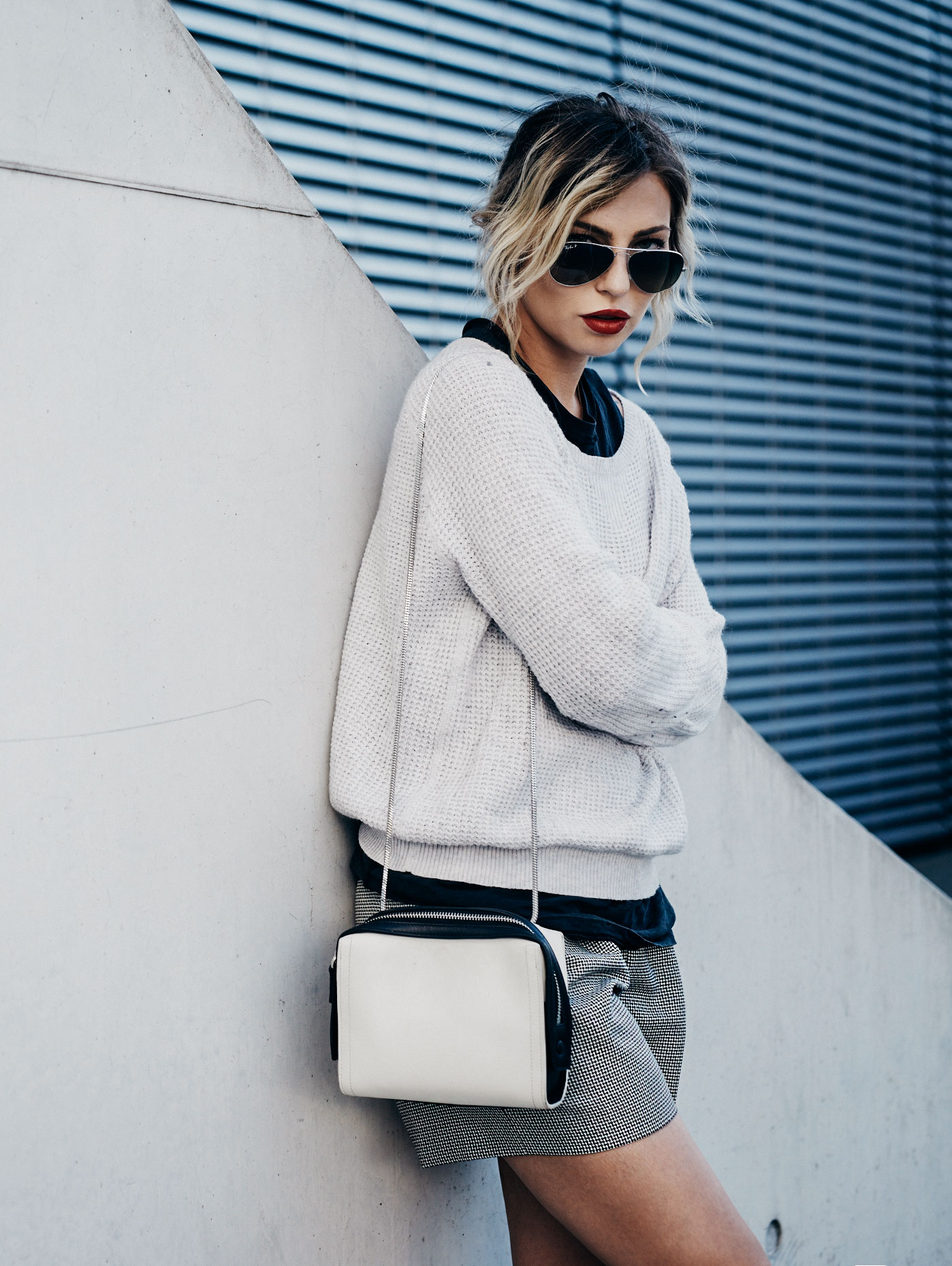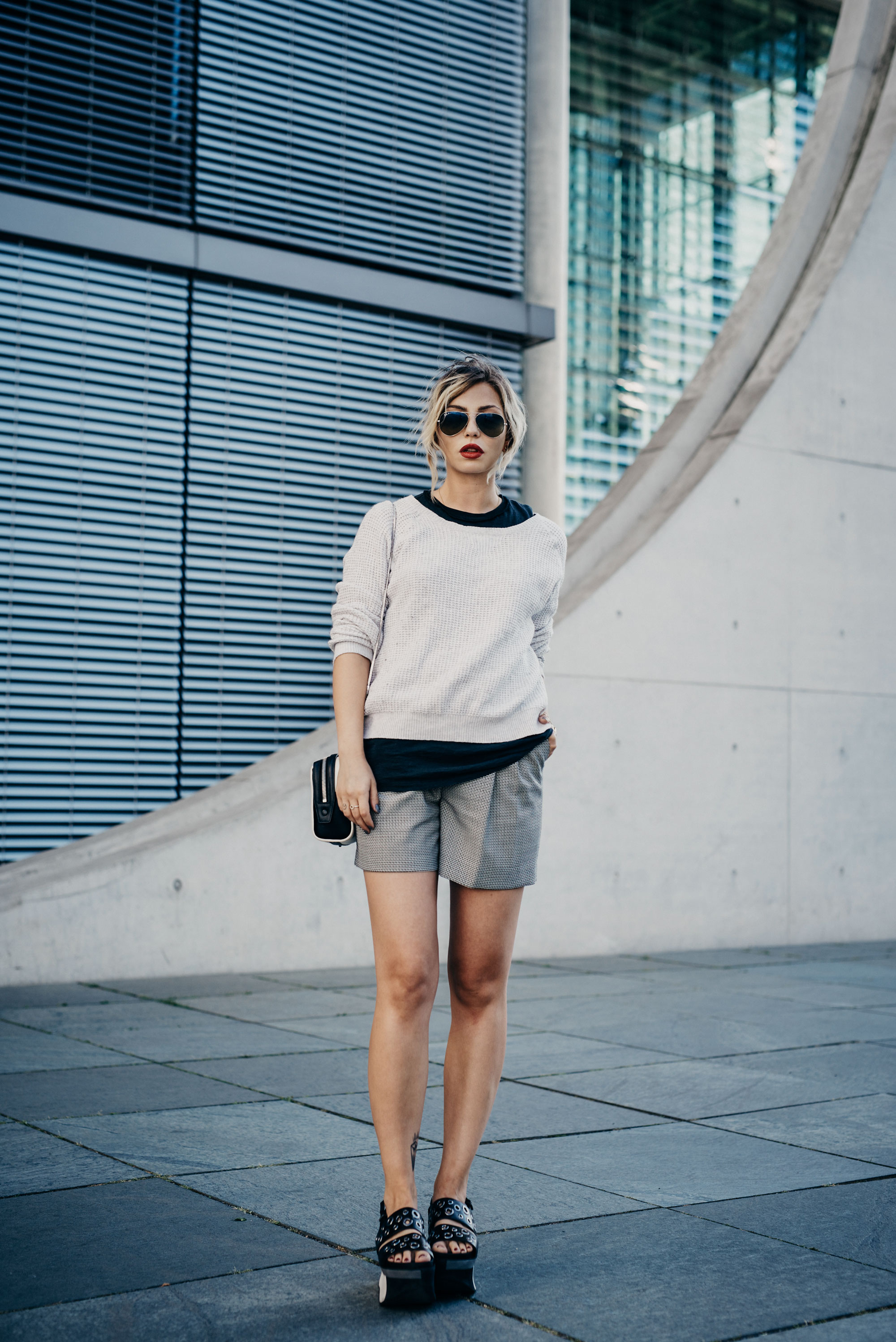 Tasche: 3.1 Phillip Lim Shorts: Reiss Schuhe: Laurel Sonnenbrille: Ray-Ban Aviator Sweater: alt (ähnlich: Madewell)