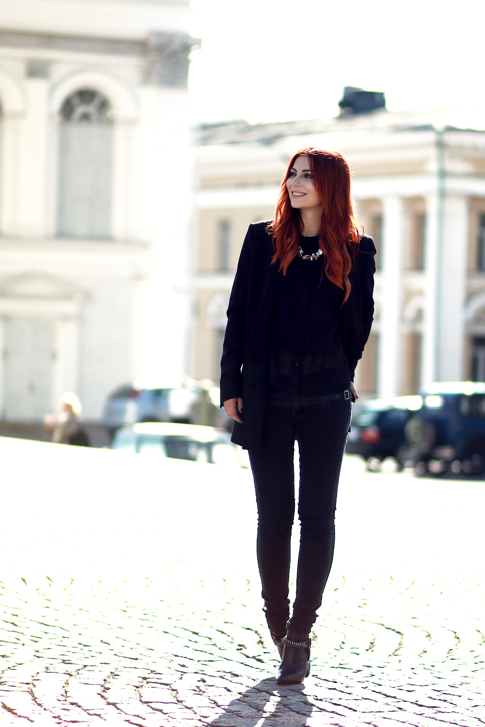 Eigentlich habe ich für heute einen vollkommen anderen Beitrag geplant, aber wir (Jana und ich) sind hier irgendwie in Paris und während wir über irgendeinen Quatsch reden, der vermutlich in wenigen Tagen zu einem Sonntagsbeitrag umgewandelt wird, schreibe ich diesen Beitrag, getunkt in Alkohol und guter Laune. Aber ich will nichts vorweg nehmen; hier kommt mein Outfit: Diesmal ist es ein Komplett-Look von Supertrash und ziemlich clean schwarz – eben so, wie ich es am liebsten habe :) Schade, dass man hier die Details nicht so gut erkennt, aber das Shirt besteht aus zwei unterschiedlich langen Lagen und die Hose hat so einen Shakira-mäßigen Lederbund – irgendwie ganz geil :D Es ist (leider schon) der vorletzte Look aus Helsinki, aber dafür kann ich euch versprechen, dass der letzte Look an einem wirklich ungewöhnlichen Ort aufgenommen wurde :)   Hab ich euch schon erzählt, dass ich mich aufs Follow-me-around freue? Ich freue mich nur nicht drauf, das ganze zu schneiden und zu einem Video zu machen, aber ich hoffe sehr sehr dass ich nächste Woche die Zeit dazu finden werde, denn was die nächsten Wochen angeht bin ich nämlich richtig viel unterwegs – aber ich freu mich schon drauf. Ebenfalls wie auf euer Feedback zu dem Look :) Actually I planned a completely different post for today, but we (Jana and I) are here somehow in Paris and while we’re talking about some nonsense that will be probably in a few days part of my sunday’s thoughts. But I won’t anticipate; here is my outfit: This time it’s a complete look from Supertrash and it’s completely black – just the way I like it :)