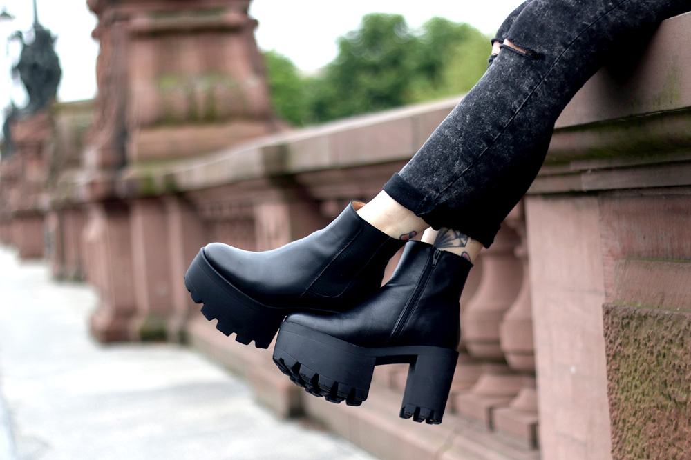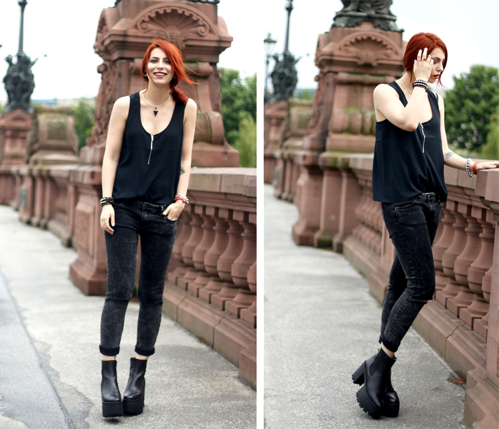 Während sich gefühlt ganz Deutschland über das gute Wetter freut, war das Wetter in Berlin bis gestern richtig ätzend: Regen, Regen, nichts als Regen. So ein Wetter bringt nicht unbedingt meine allerbunteste Sommerlaune hervor – offensichtlich. Umso besser, dass ich grade so viele hübsche neue schwarze Sachen habe, die ich ausführen kann: allen voran meine neuen Lieblingsboots, die grade beim Pfützenwetter tolle Dienste leisten. Ich meine, von der Seite sehe ich ein bisschen aus wie ein Clown, aber sie sind superbequem (da flach) und ich liebe das krasse Profil. Klar, sie sind, vorsichtig gesagt, Geschmackssache, aber ich find die super!! Ansonsten ist das Outfit ein ziemlich typisches Alltagsoutfit, aber genau deswegen mein Montagsoutfit: schlicht, bequem, schwarz :)While everybody is happy about the warm weather in Berlin it’s cold and rainy. Maybe that’s why I’m not that much into summer looks – as you can see. Anyway I like this look, because it’s such an easy black outfit :)