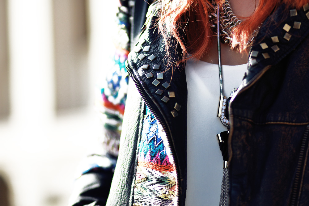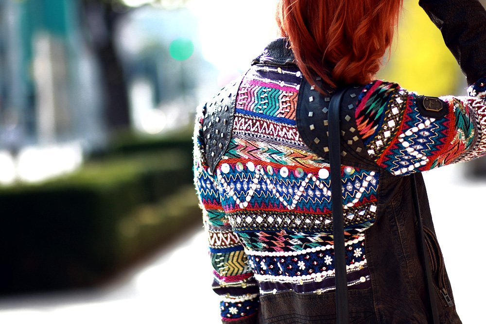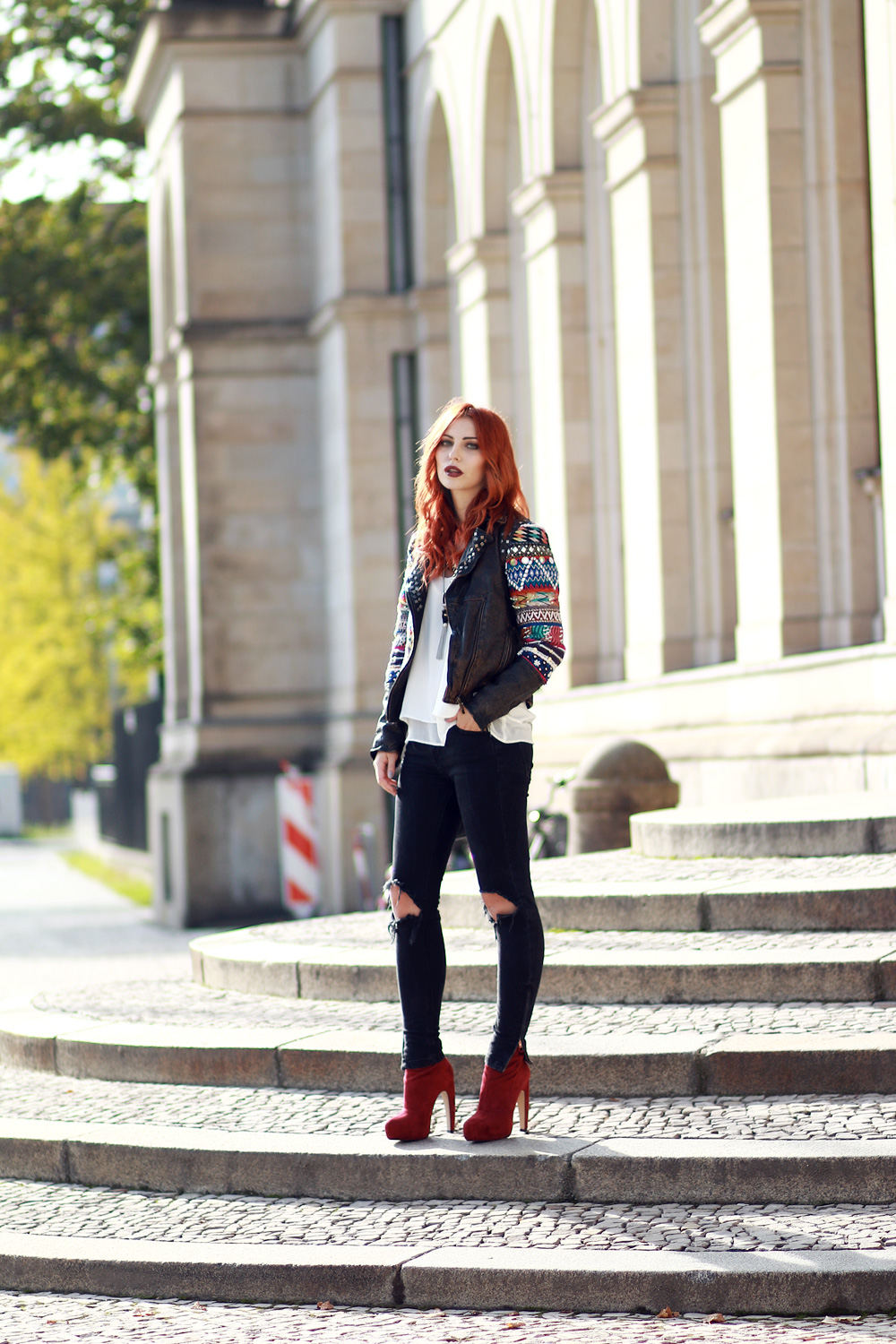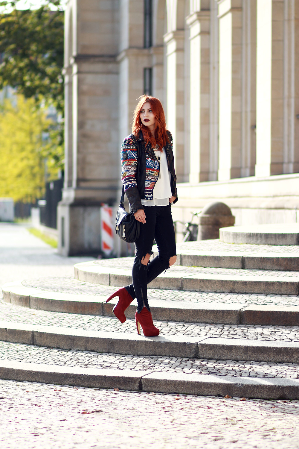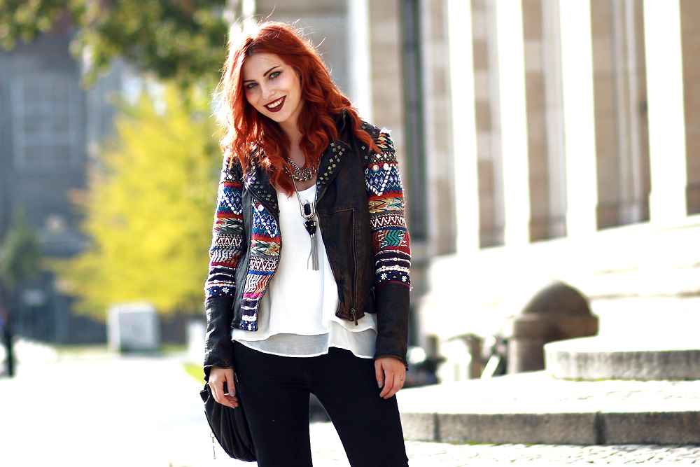 Ich habe es mir so sehr gewüscht und es ist eingetroffen: Ein letztes Mal habe ich noch einen Eisbecher gegessen. Ein letztes Mal habe ich draußen stundenlang vorm Cafe gesessen und die Sonne genossen. Ein letztes Mal habe ich meinen Arbeitsplatz auf den Balkon verlegt. Ein letztes Mal bin ich im Trägertop und Sonnenbrille rumgerannt. Ein letztes Mal habe ich den Sommer genossen. Ein letztes Mal habe ich einen richtigen Sommerlook getragen.   Letztes Wochenende wurde ich noch mal richtig warm und sommerlich in Berlin, sodass ich nun zum letzten Mal das Sommerwetter noch mal richtig ausgekostet habe. Und deswegen gibt es heute meinen letzten Sommerlook des Jahres, bevor ich mich nun endgültig dem Herbst widme und die kalte Jahreszeit in die Arme schließe. Aber dieses letzte Mal bewusst genießen, das musste einfach sein!   Diese kunterbunte Jacke hing schon länger bei mir im Schrank und entweder es war zu warm zum Jackentragen oder zu unsommerlich, denn dieses besondere Stück verdient Sonne und strahlt sogar bei Regen eine bunte Fröhlichkeit aus, die ich bei Regenwetter selbst kaum ertragen kann. Im übrigen ist es auch das bunteste Stück bei mir im Kleiderschrank, aber ich mag diesen Boho Look bei der Lederjacke einfach, obwohl ich sonst kein Fan von solchen kunterbunten Mustern bin. Mir ist außerdem aufgefallen, dass ich keine richtig hohen Sandaletten habe, aber das steht dann für nächstes Jahr auf der Wunschliste! Last weekend I was again really warm and summery in Berlin, so for the last time this year I enjoyed the summer weather. And that’s why today I show you my last summer look of the year, before I finally wear all my autumn clothes and the cold season close can start.   This leather jacket hung in my closet for a while now and either it was too warm to wear a leather jacket or too rainy, because this piece deserves to be worn when sun shines and even when it rains it’s a colorful piece of happiness. By the way, it’s the most colorful piece in my wardrobe, but I like this boho look here, even though I’m not a fan of these colorful patterns usually.