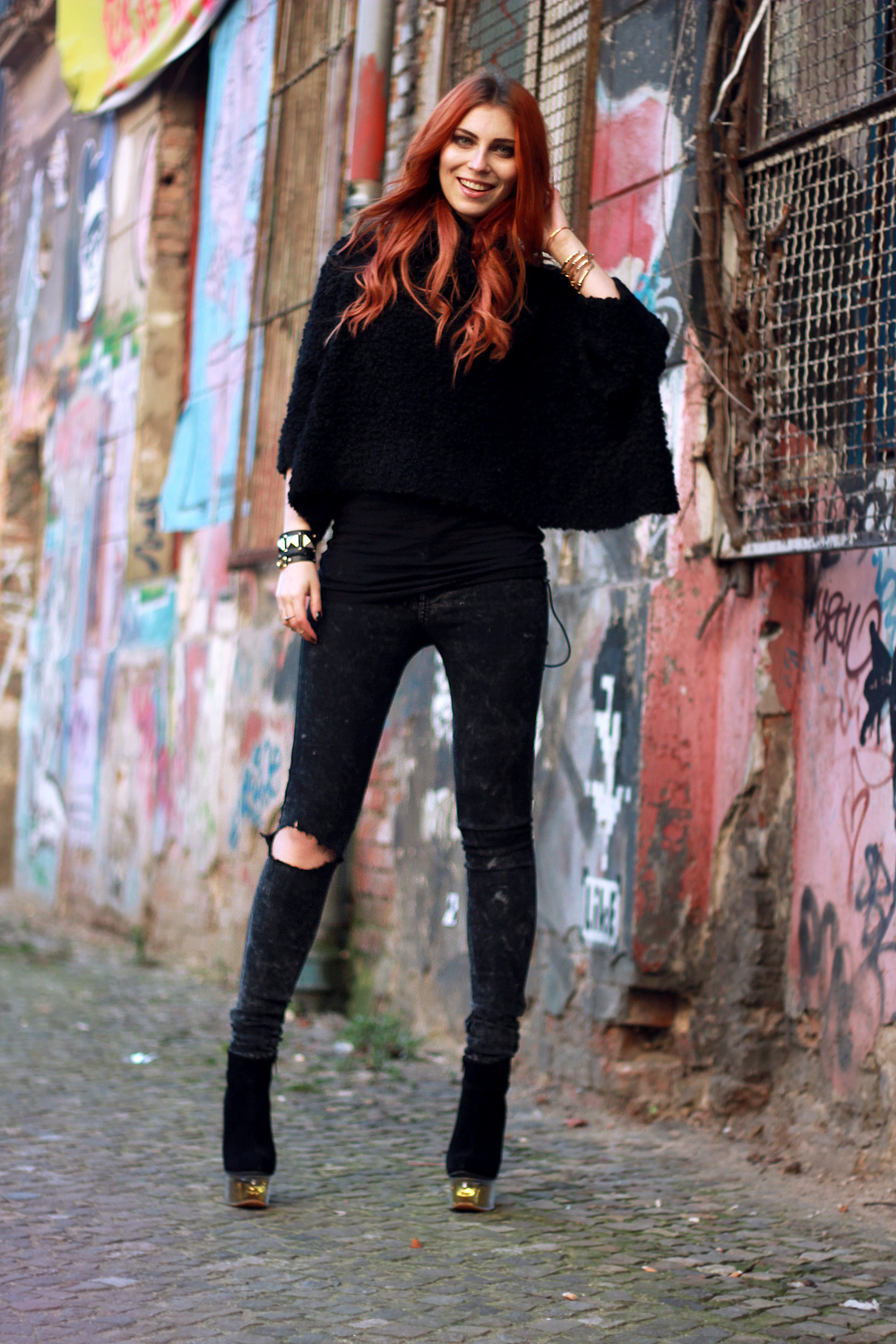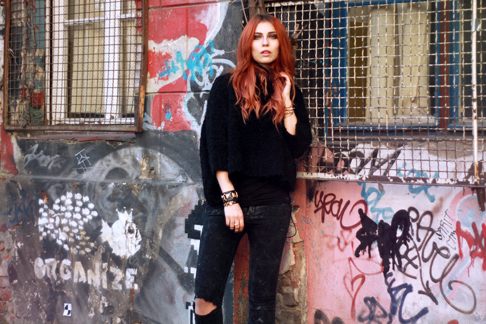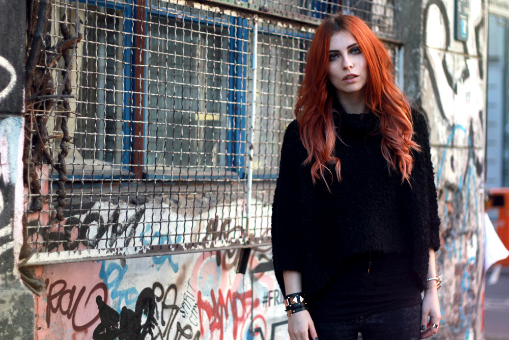 7. Masha ! ich mag so sehr deinen style! deine tollen leuchtenden haare und dazu schwarz sieht verdammt gut aus. die jeans ist top und die skeltthand gefällt mir auch sehr!!! nimm mich mit zur fashion week. yeah!!!!