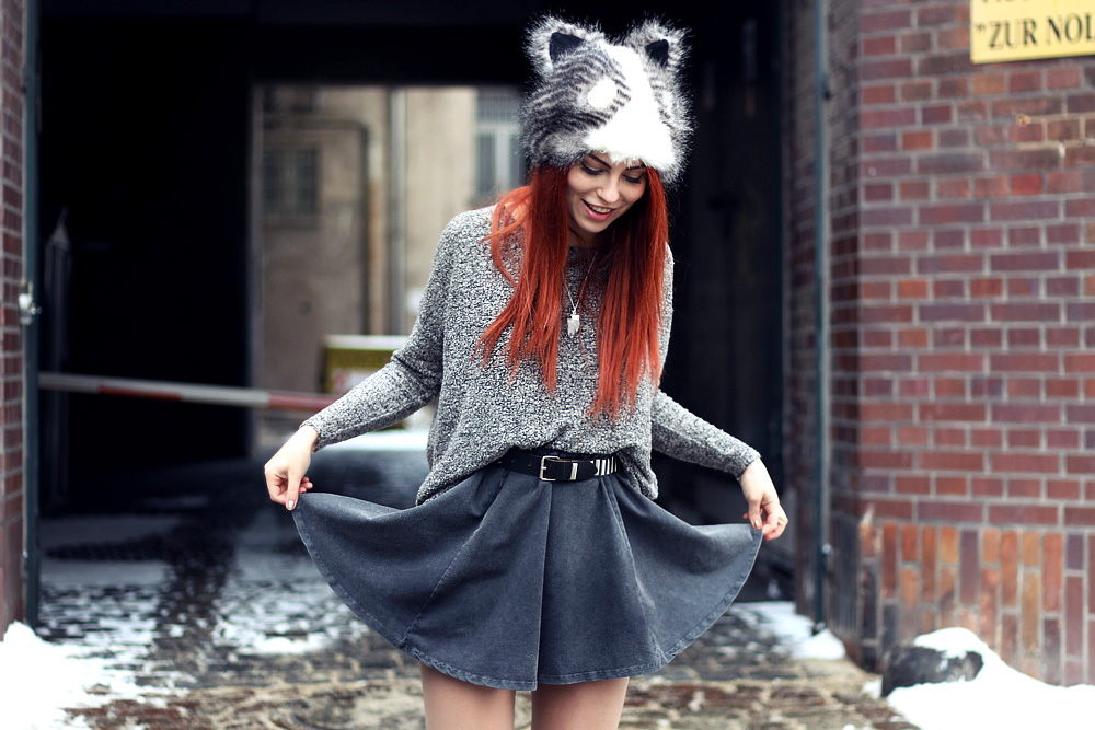 Ich habe mich von den kalten, grauen Februartagen inspirieren lassen und passend zum Wetter zu Grautönen gegriffen um eins mit meiner Umgebung zu werden. Obwohl grau ja eher der Langweiler unter den Farben ist, finde ich das Outfit so gar nicht langweilig. Das liegt daran, dass der Wind meinen Rock immer aufgebauscht hat (Hello Marilyn!), aber nicht auch zuletzt an der Mütze. Ich habe sie letztes Jahr in London gekauft, aber durch den Umzug ist sie irgendwie in Vergessenheit geraten, bis ich sie vor einiger Zeit beim Kistenpacken wieder ausgegraben und mich neu verliebt habe. Spätestens als Lina mich fragte, ob ich denn eine warme Mütze für sie hätte und ich mit den Worten “Oh ich weiss was dir gefallen wird…” das gute Stück rauskramte feiert diese legendäre Mütze ihr Comeback und erfreut nicht nur mich mit ihrem schrecklich süßen Look, sondern auch die Leute auf der Strasse, die übers ganze Gesicht grinsen, wenn ich an ihnen gutgelaunt vorbeidackel.