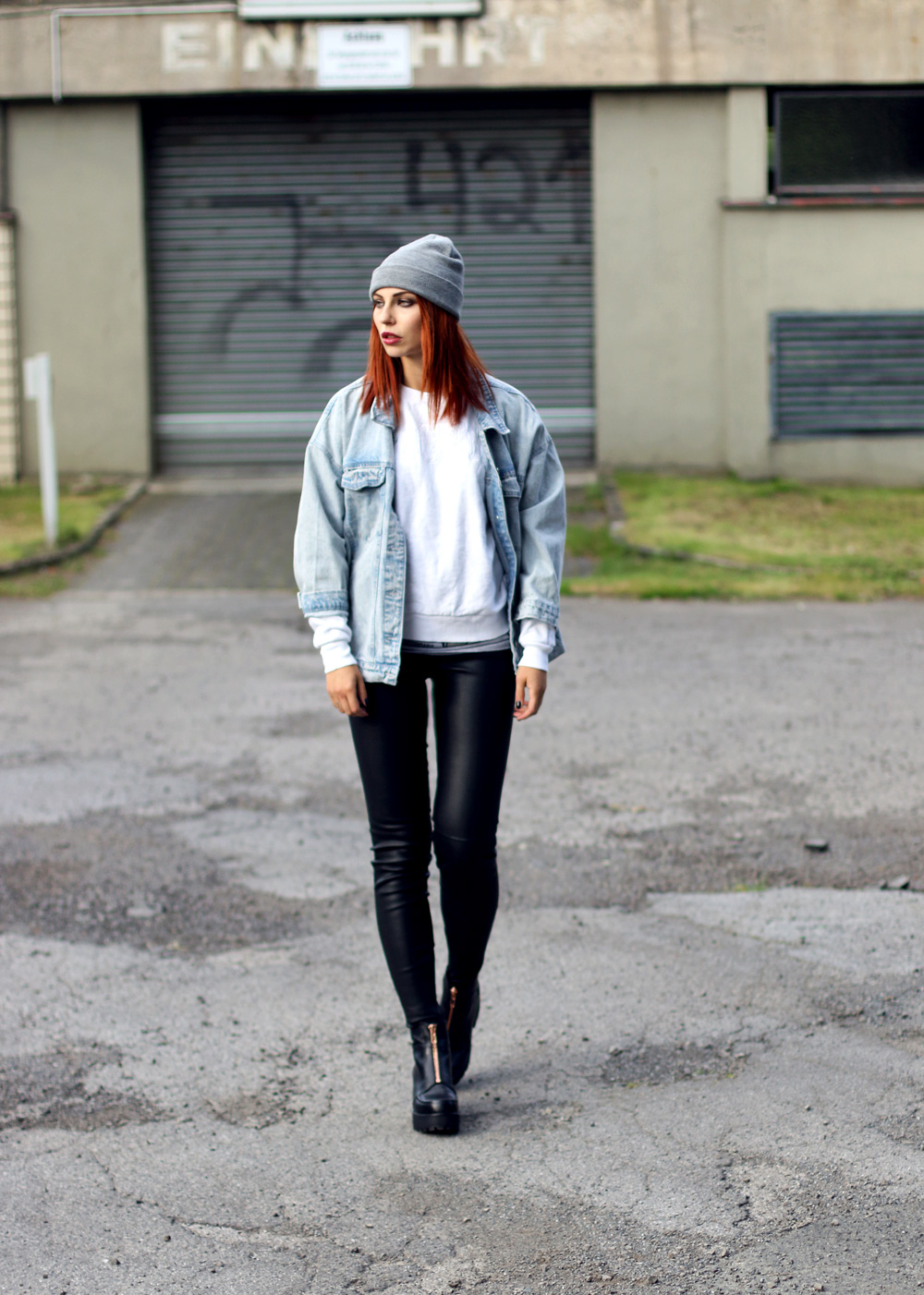2. Genau mein Ding der Look. Ich fänd zwar nen etwas längeren Pulli mit etwas mehr Ausschnitt noch toller dazu aber an sich mit der Beanie und der XL-Jeansjacke ein Outfit ganz nach meinem Geschmack. Einfach sau bequem und lässig! Steht dir eh mit am besten sowas find ich! Viel Spaß dir noch!
