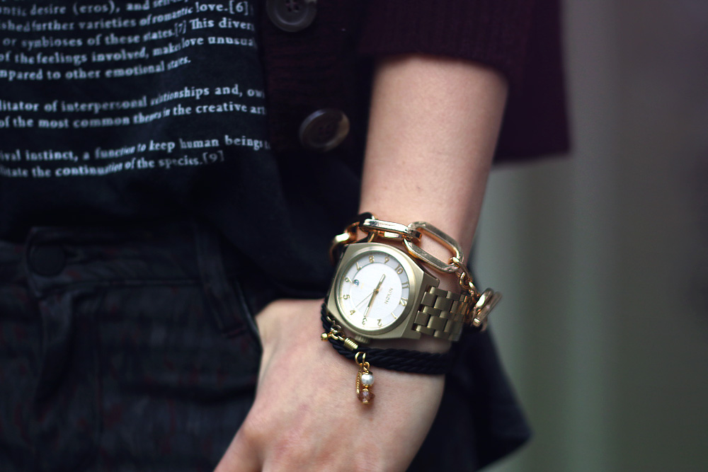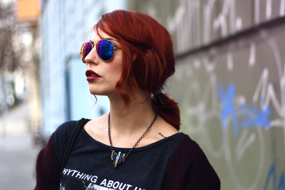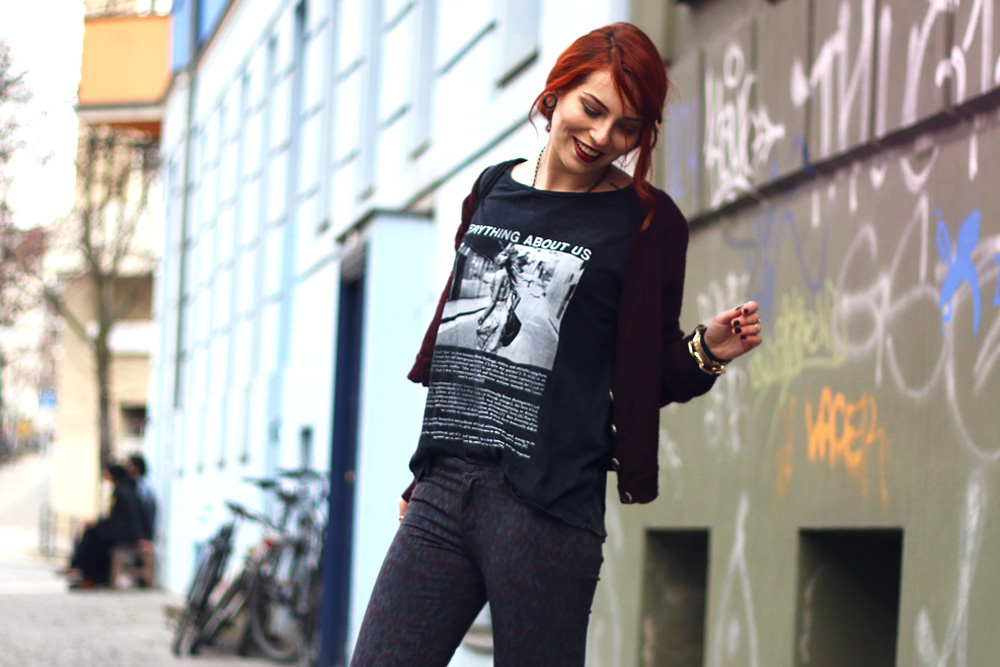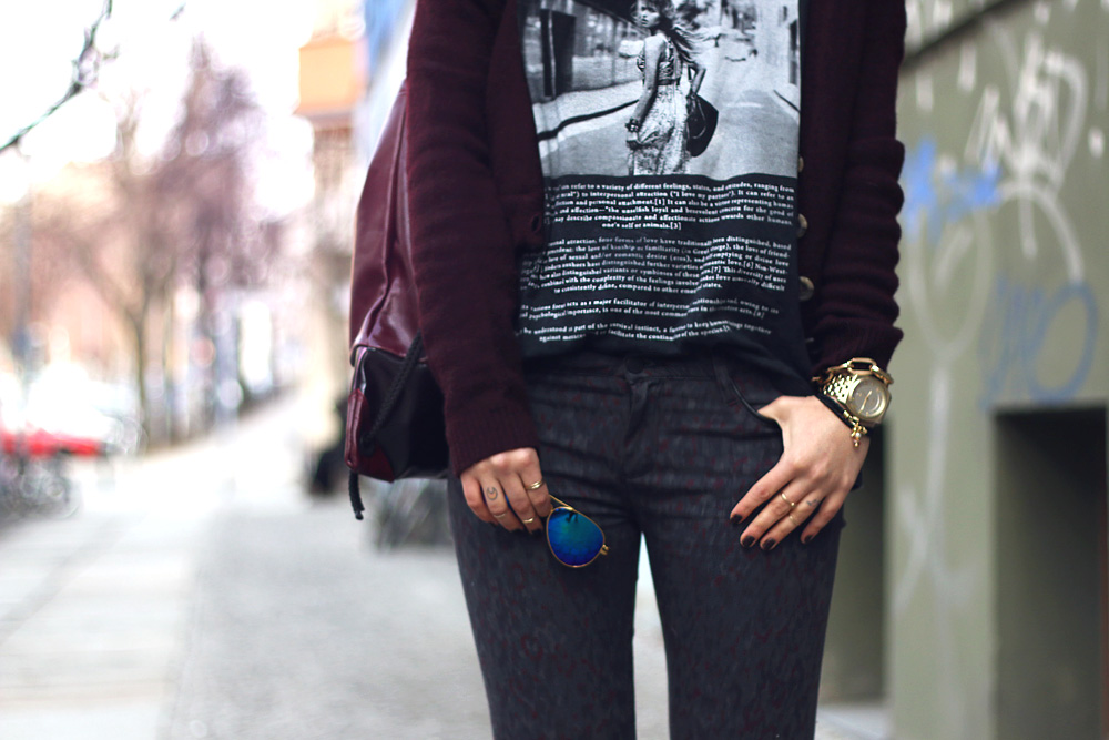 Obwohl der Look nicht schwarz ist (nein, auch das Tshirt ist dunkelgrau!) finde ich ihn trotzdem richtig, richtig cool und habe mich unheimlich wohl darin gefühlt. Die Hose hat ein interessantes Muster, ein bisschen wie Leopardenpunkte-Pinselstriche in bordeaux und so grau/khaki. Ich habe anfangs nicht so recht gewusst, wie ich sie kombinieren sollte und tat es am Ende so, wie ich Jeans am liebsten kombiniere – mit einem runtergerockten, ausgewaschenem und zu großem Tshirt – das geht nämlich immer! Dazu ein Cardigan (schliesslich haben wir noch keinen Sommer!), etwas derbere Pumps (oder sind das eher Boots? Keine Ahnung!) und die Tasche bzw. der Lederbeutel, der auch nicht zu schick aussieht, sondern eher lässig von der Schulter baumelt. Was man leider auf den Fotos nicht so gut erkennen kann, ist, wie cool er in einem Oil slick schimmert, passend zu meiner Kette und Brille, die dem ganzen Look noch mal ein bisschen das Frühlingshafte geben, oder ist euch der Look doch zu herbstlich?