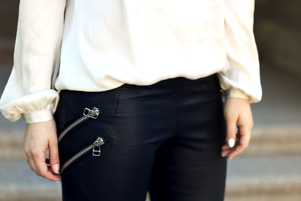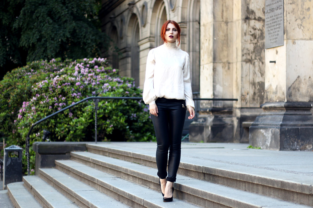 Als ich diese Seidenbluse zum ersten Mal gesehen habe, war ich vollkommen aus dem Häuschen. Es ist einfach das p e r f e k t e Stück: elegant und trotzdem unendlich weiblich. Sexy verspielt und gleichzeitig zurückhaltend. Selten hat mich eine Bluse so sehr begeistert wie diese hier. Bei der Hose war ich mir anfangs total unsicher, ob das auch wirklich Leder ist, denn sie ist so strechig, als wäre das Stoff. Da war ich selbst total irritiert, aber da sieht man mal den Unterschied zwischen einer normalen Lederhose und einer besonders hochwertigen. Sowieso bin ich total verliebt in das Outfit, nicht nur, weil es irgendwie schlicht und trotzdem besonders ist und mich an eine viktorianische Prinzessin im 21sten Jahrhundert erinnern lässt, sondern auch weil ich mich direkt ganz anders darin bewege, mich darin fühle – wie eine Prinzessin eben? Kennt ihr das? Wenn man seine Haltung und seinen Gang seinem Outfit anpasst, um dem ganzen gerecht zu werden?   Übrigens: Weil das Teile aus der kommenden Herbst/Winter Kollektion sind (hättet ihr das gedacht?) sind sie noch nicht online und grade noch in der Produktion, aber wozu gibt es schliesslich Merklisten. Die Wartezeit kann man sich dann so lange mit den um 60% (!) runtergesetzten Stücken vertreiben ;) Do you know this feeling when you’re wearing such an perfectly elegant outfit, that your moving and your attitude changes immediately? Well, this is one of those outfits. It’s elegant, but feminine. Sexy, but reserved. I really feel like a modern victorian princess in the 21th century :)