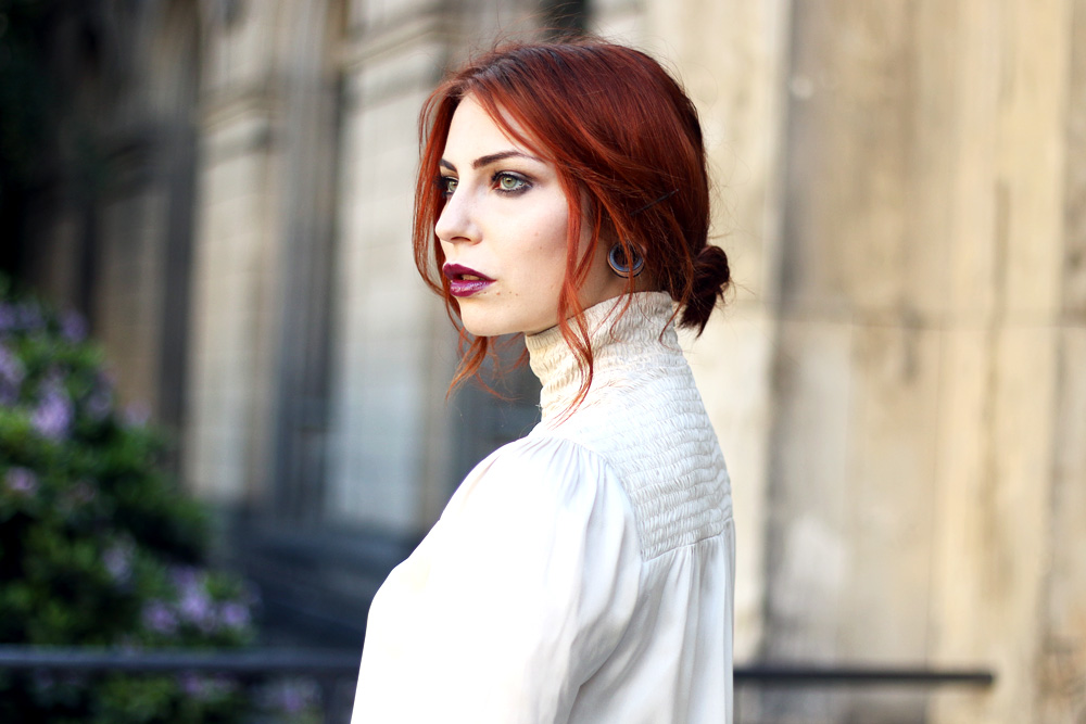 Und, vorab sei gesagt, ich meine es nur gut und als konstruktive Kritik ;) aber ich finde, dass dir dieser helle Ton der Bluse gar nicht steht – obgleich du hübsch bist (schon 1000 mal gesagt) und die Bluse mir auch gefällt. Aber du wirkst so blass dadurch, dass du fast krank bzw. wie ein Vampir aussiehst. Ich kenne das Problem von mir (hellhäutig >9000) und trage deshalb nie solche hellen Cremetöne, weil ich dann einfach blutleer und krank aussehe. Aber wie gesagt, das ist nur meine persönliche Meinung.