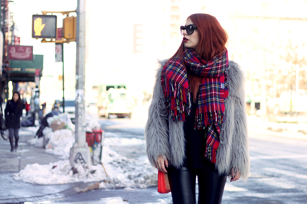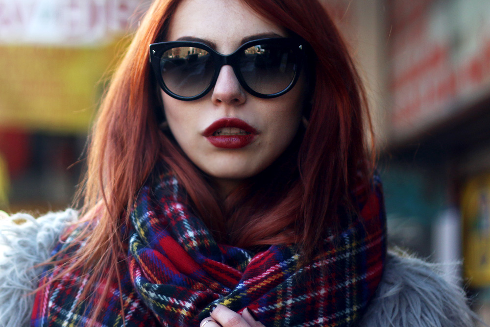 Ein cooles Outfit in einer absolut coolen Umgebung – besser geht es kaum noch. Die roten Haer, die roten Lippen und der Schal dazu – das finde ich genial!