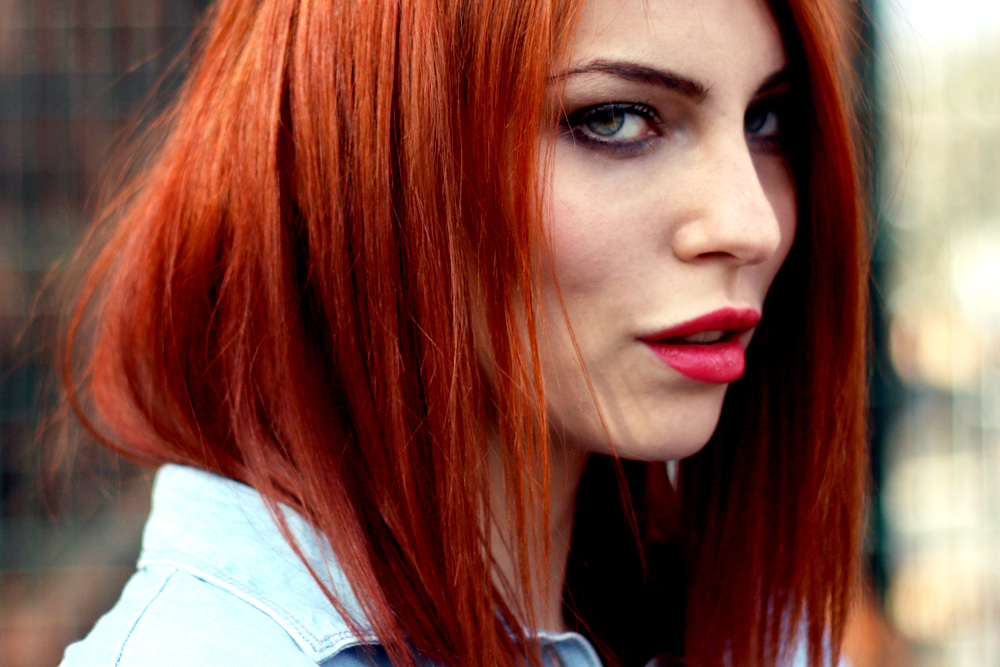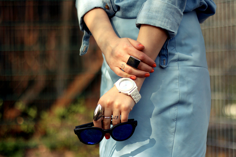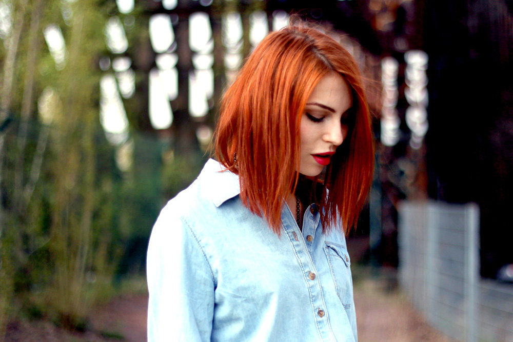 Ich muss sagen, dieser Look packt mich total! Ich liebe die Kombi vom Lederrock mit den Turnschuhen. Aber noch viel viel schöner finde ich den Kontrast von deinen roten Haaren auf dem hellblauen Hemd.