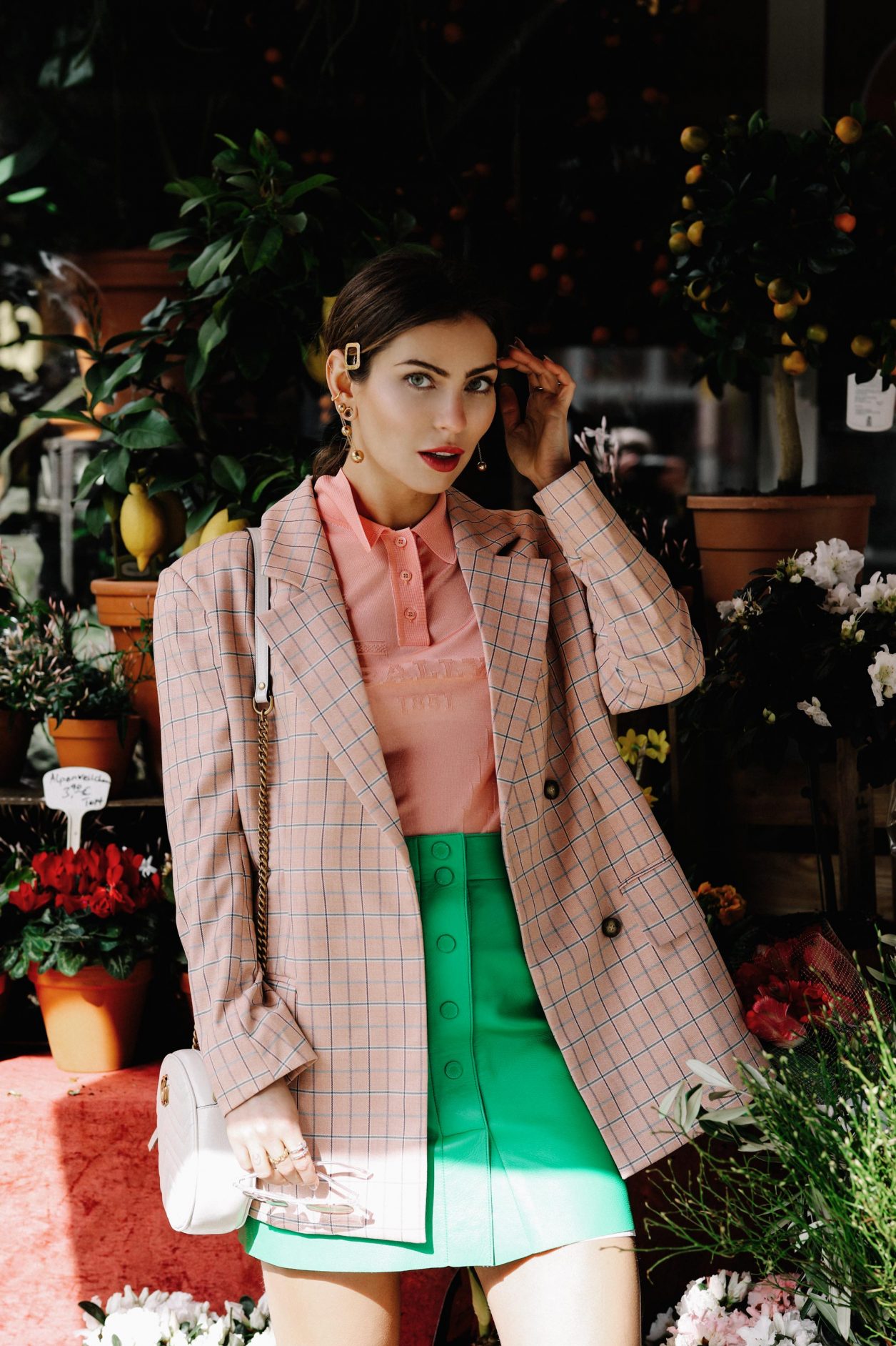 The Pink Blazer Anzeige Blazer: AsosPolo: BallyLeather skirt: SandroBag: GucciSneakers: IroGlasses: YunHair pin: Asos