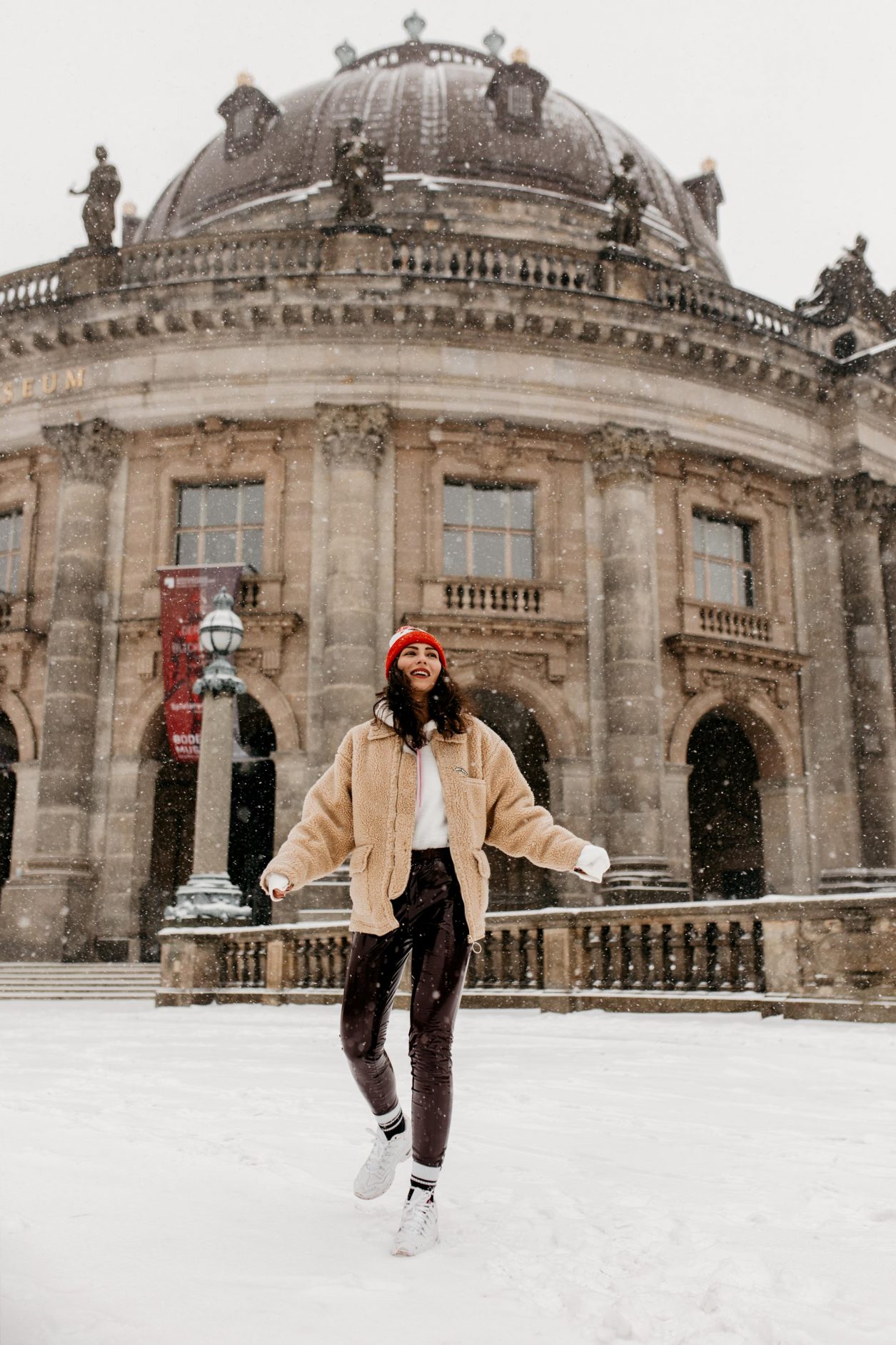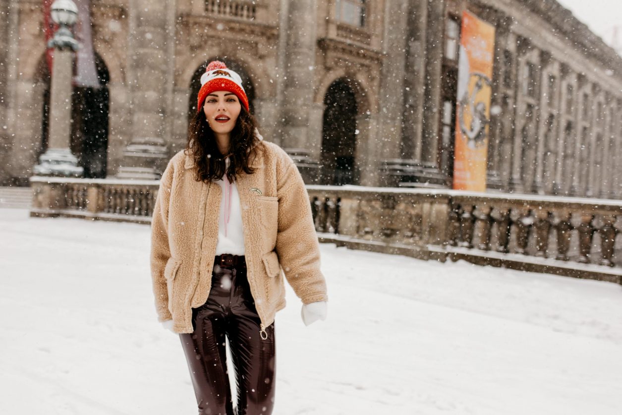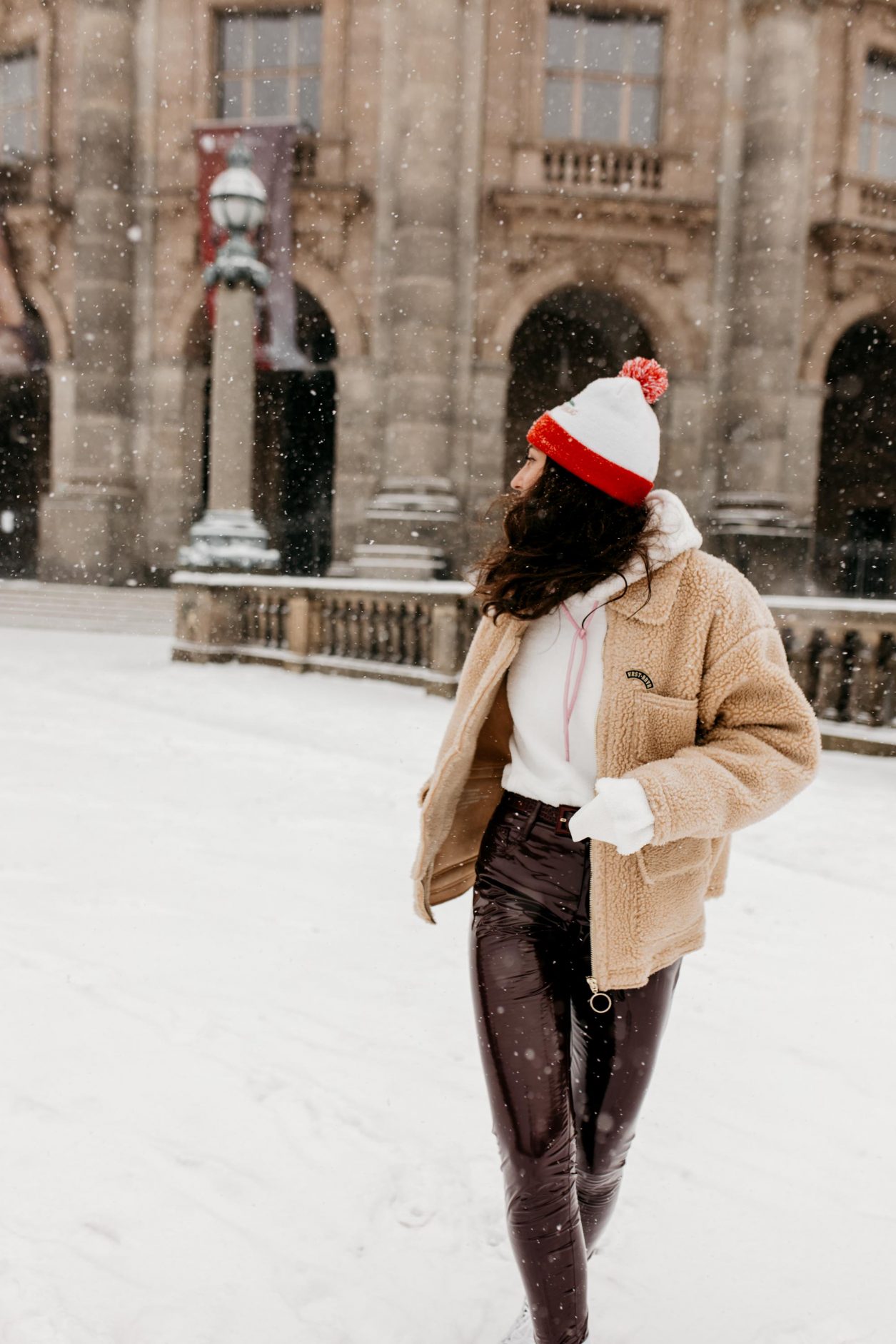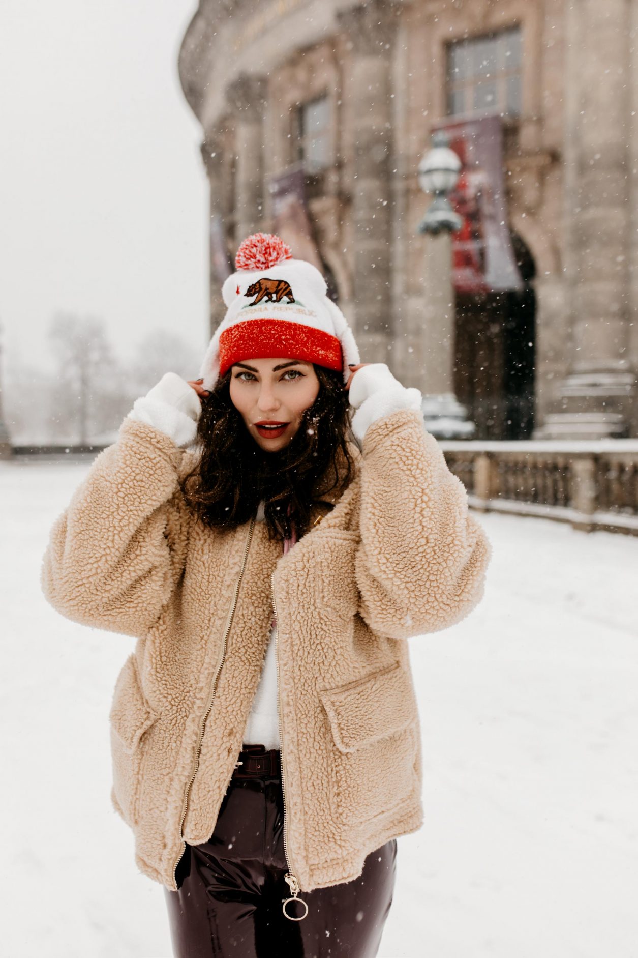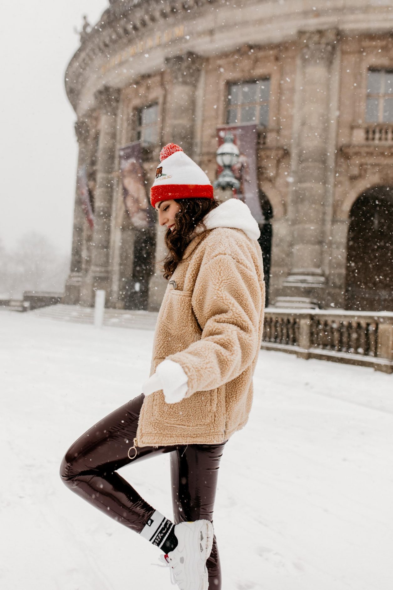 How to style a Teddy Coat Anzeige Beanie: Souvenir aus CalifornianTeddy Jacket: WrstbhvrLack pants: River IslandsSocks: NikeSneaker: Skechers
