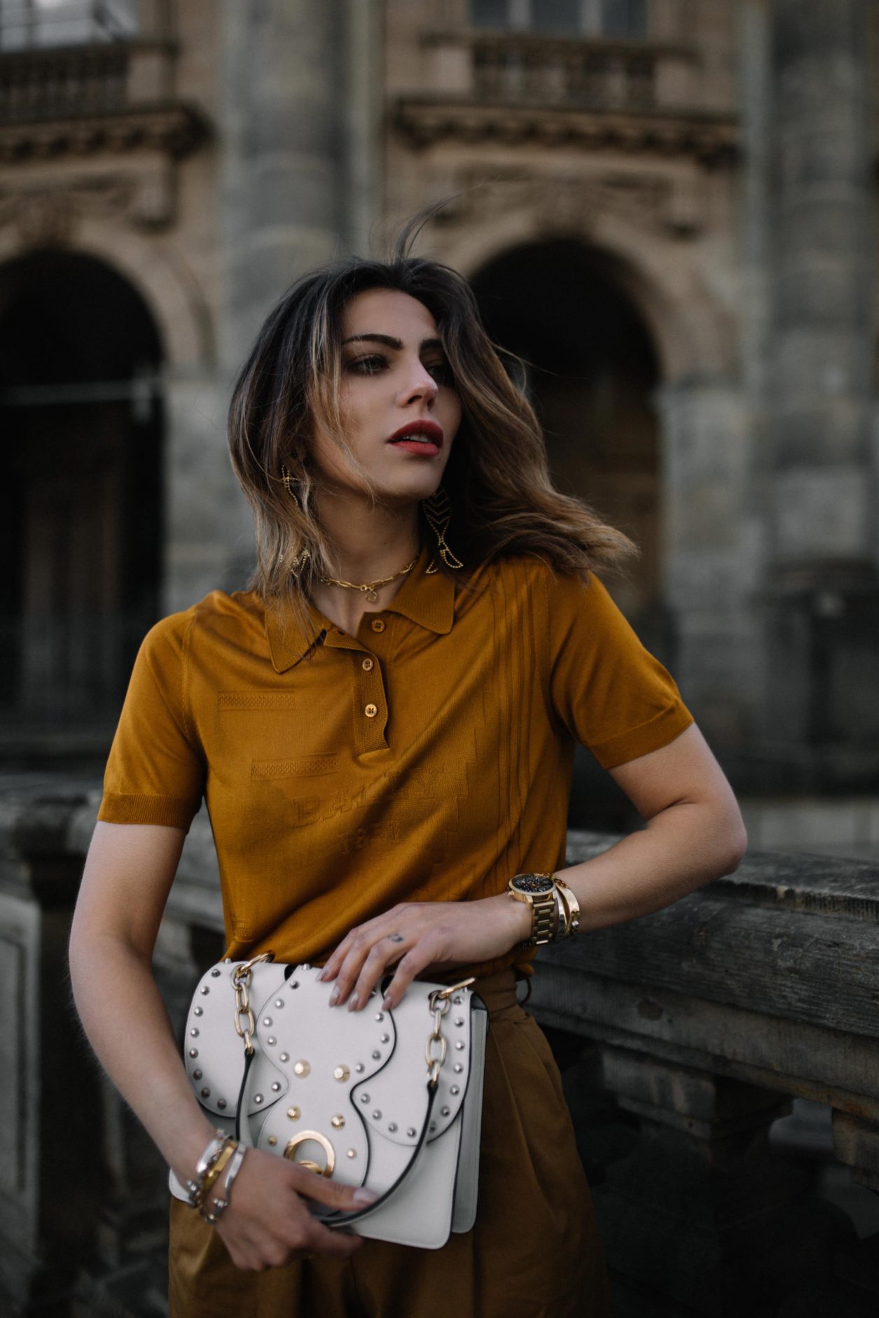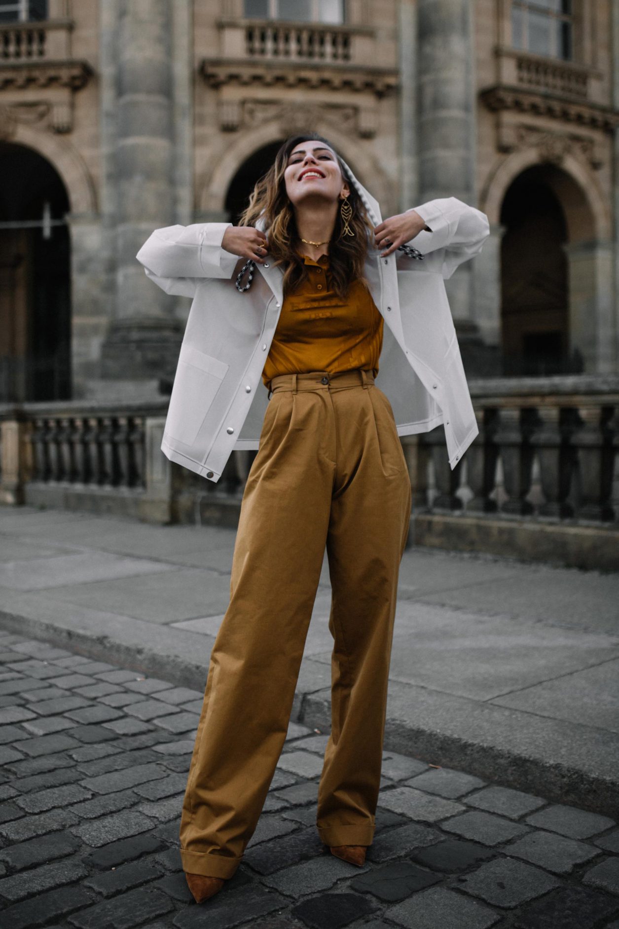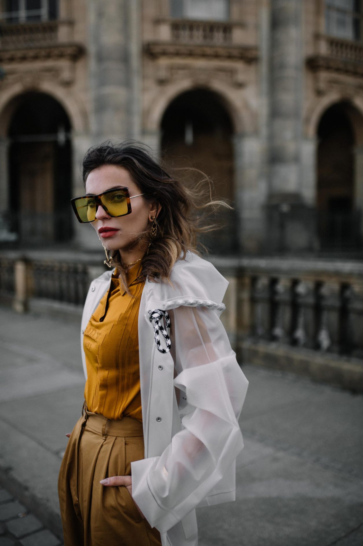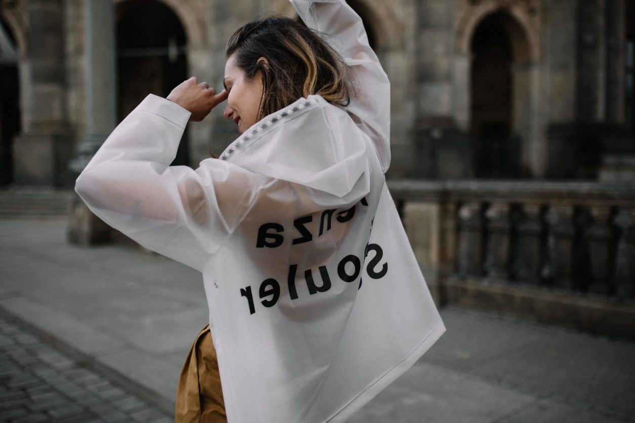 The Rain Coat Anzeige Jacket: Proenza SchoulerShirt: BallyPants: BallyGlasses: GucciBag: Miu MiuPumps: JacquemusEarrings: Tory Burch