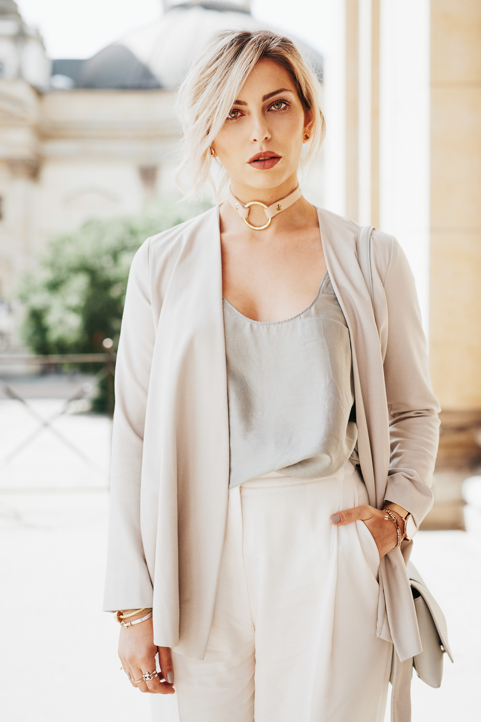Inspiriert von der Fashion Week und all den wunderschönen zarten Farben und fließenden Stoffen, die ich auf den Laufstegen gesehen habe, habe ich mich zur Abwechslung mal wieder auch für ein Outfit für ganz in Pastellfarben entschieden. Mir ist nämlich aufgefallen, dass ich das auch schon lange nicht mehr hatte, vermutlich weil es nur wenig edgy und dafür sehr weich und feminin aussieht. Um dem ein bisschen entgegenzuwirken habe ich mich für eher luftige und fast schon maskuline Schnitte entschieden und noch einen Leder-Choker dazu kombiniert. So ganz ohne geht bei mir dann halt eben doch nicht.