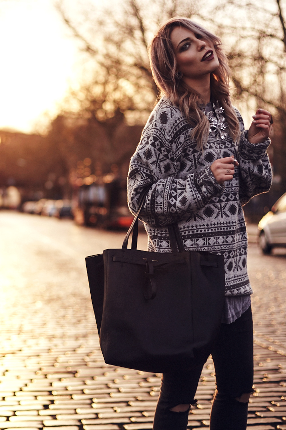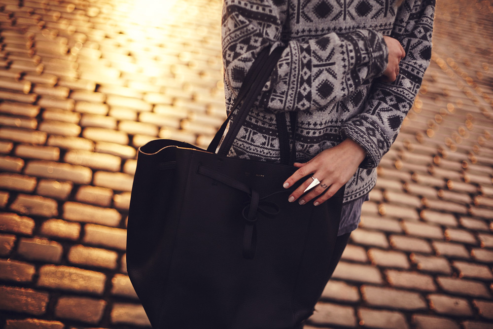 Was hatten wir für ein Glück letztens doch noch einen der begehrten und selten gewordenen Sonnenuntergänge (um 15 Uhr!!) zu beobachten! Passend zu dieser Traumkulisse trug ich eins meiner Lieblingsoutfits. Bei mir zeichnet sich übrigens ein Lieblingsoutfit als solches aus, wenn ich größtenteils Lieblingsteile, also Teile, die ich häufig trage und das über einen längeren Zeitraum hinweg, miteinander kombiniere. Dazu gehört ganz selbstverständlich die Hose und die Boots, sowie die Kette. Neu hinzugekommen ist allerdings der warme Wollpulli mit Norwegermuster, der trotz dessen überhaupt nicht kitschig wirkt und meine neuste Eroberung: der Celine Shopper – mein ganz persönliches Weihnachtsgeschenk – von mir an mich.   Übrigens: wenn ihr mir eine Freude machen möchtet, dann votet doch für mich beim Stylight Blogger Award als Best German Style Blog! Es wäre wirklich eine große Ehre mit eurer Hilfe diesen Award zu gewinnen! ♥ How great it is to watch one of the rare sunsets in winter! It was the perfect location for my newest outfit, combining lots of old favorite pieces like the jeans, the boots and the necklace with new favorite pieces like the warm jumper or my new Celine shopper, which is a Christmas gift – from me to me.   By the way: I’m nominated for the Stylight Blogger Award as the Best German Style Blog and I’d be soooo happy if I could win this award with your help! Please vote for me! ♥