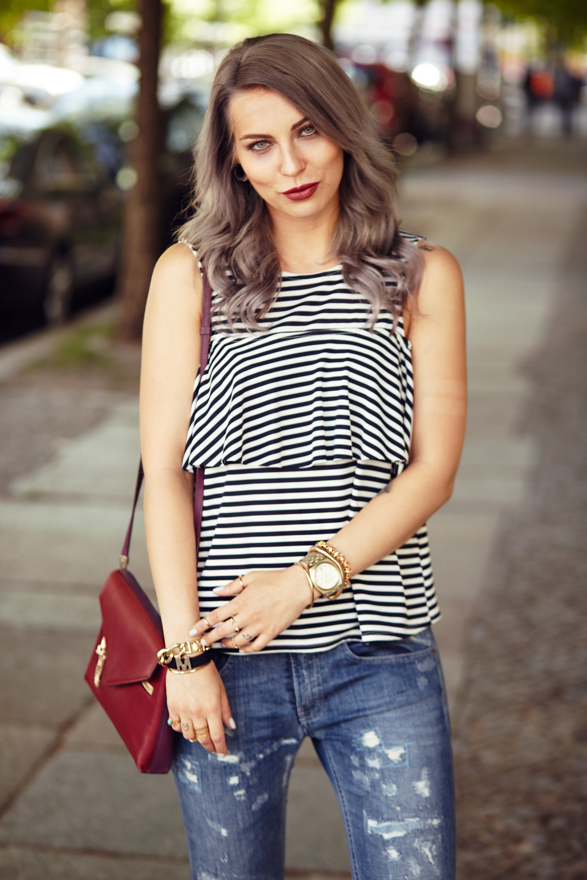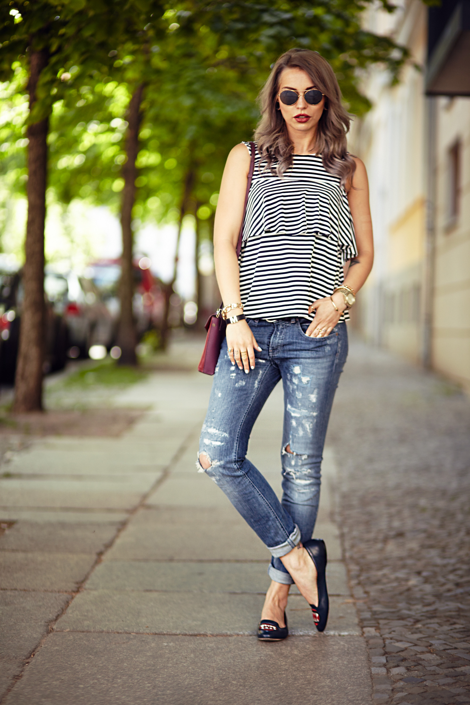 Zur Zeit bin ich ganz verliebt in Streifen und diesen maritimen Style, der zwar eher untypisch ist für Berlin, dafür umso besser nach Hamburg oder Paris passt. Das Oberteil trägt ziemlich auf, denn dank der Streifen, oversized Form und dem steifen Material sieht man doppelt so breit aus wie sonst, aber immerhin sind die Volants ideal für kleinbusige Frauen wie mich. In Kombination mit den Ballerinas und der Jeans bekommt der Look ausserdem ein bisschen was von der französischen Leichtigkeit. Die Ballerinas sind sowieso mein absolutes Lieblingsstück zur Zeit, denn sie stammen aus der Karl Lagerfelds Choupette Kollektion und sind tierisch bequem und vor allem tierisch süß mit den kleinen Katzenmonster-Zähnchen drauf. Der Sommer kann kommen! Right now I’m crazy about stripes and this maritime style somewhere between Hamburg and Paris. But my favorite here are this super cute ballerinas from Karl Lagerfeld’s Choupette collection. They are not only cute, but comfy!