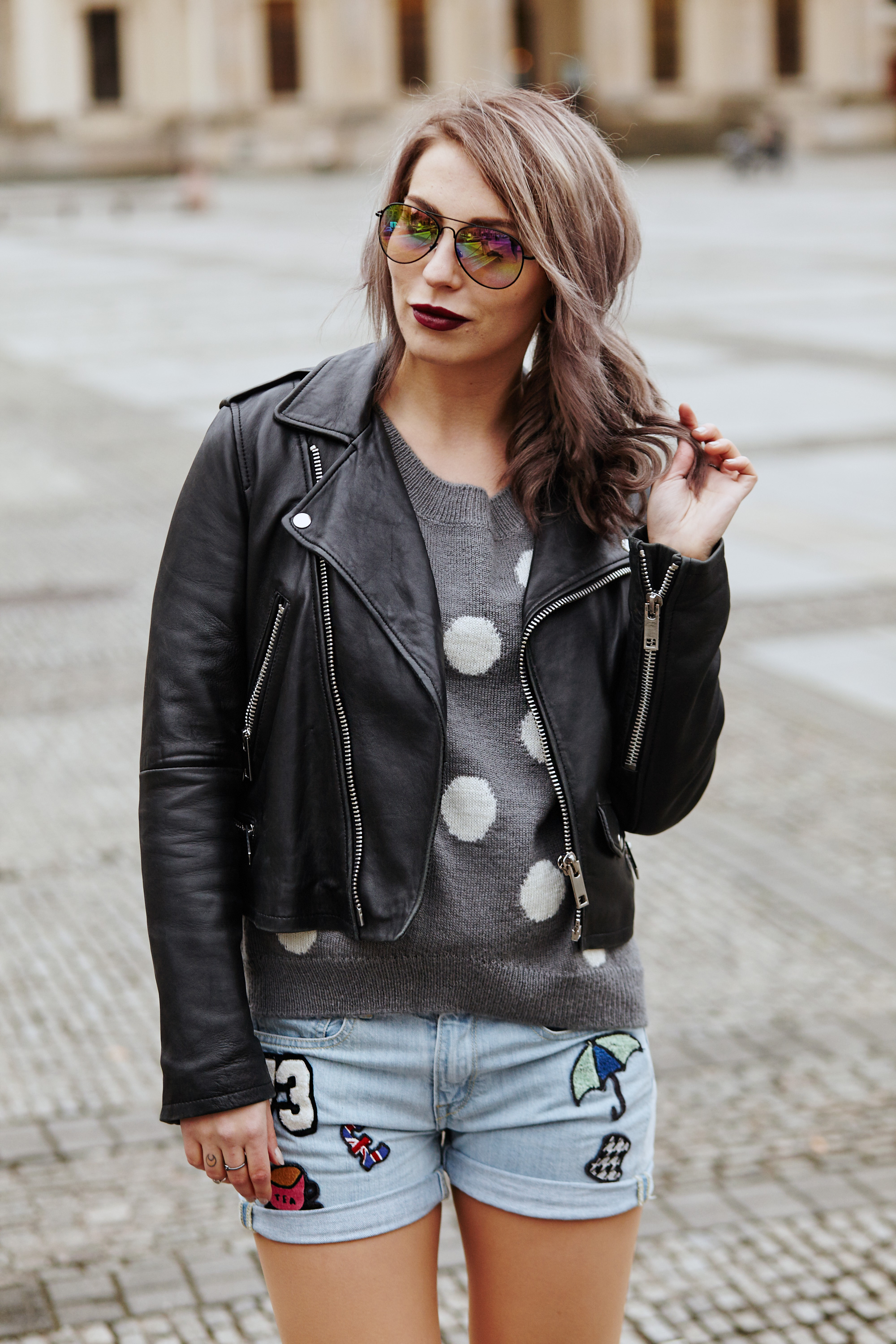 die lederjacke über dem pulli sieht echt cool aus und die shorts haben etwas spaßig-frisches ;)!