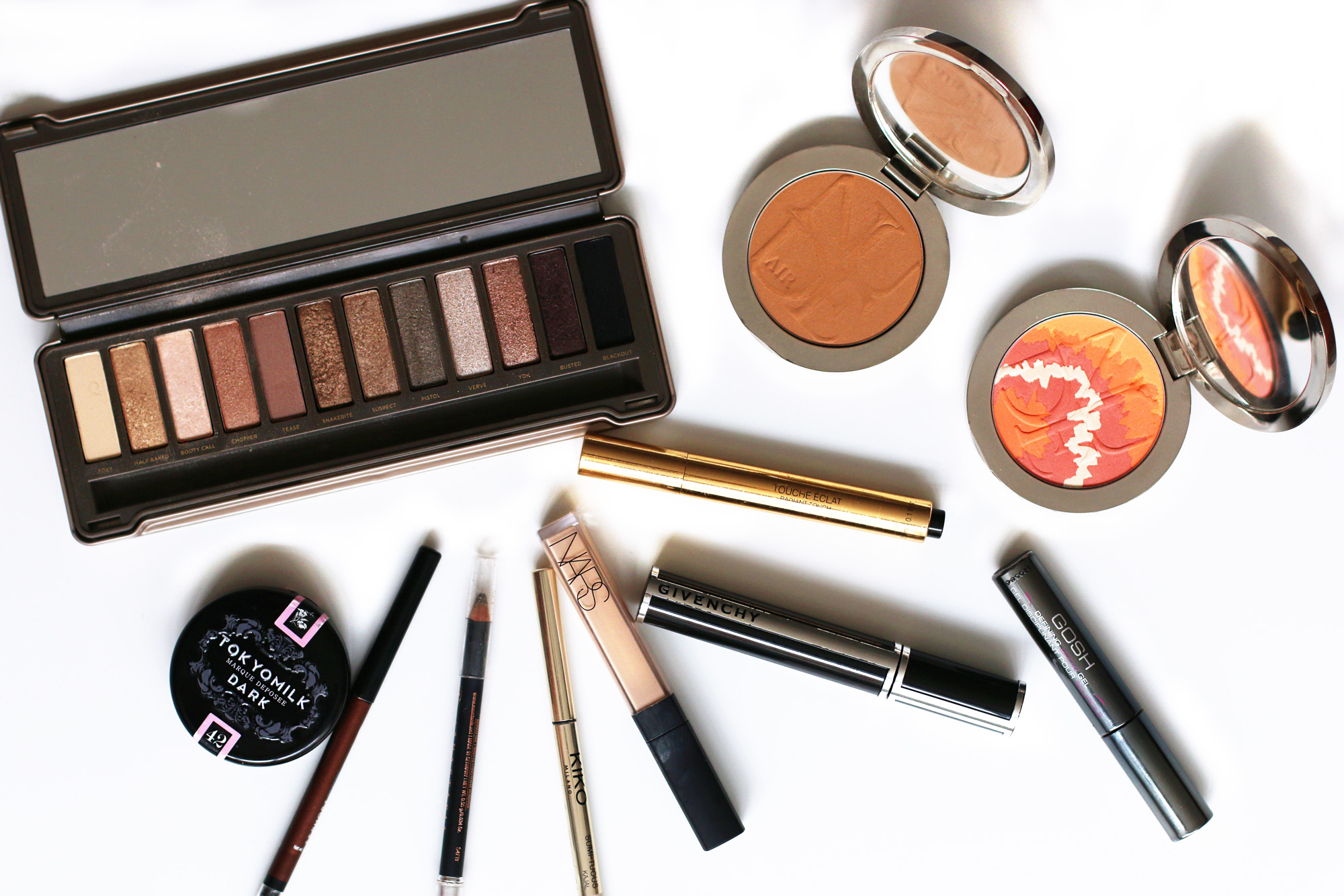 Statt Foundation benutze ich nur Concealer. Unter den Augen bevorzuge ich einen von Nars, den ich in den USA gekauft habe und der seitdem unverzichtbar ist. Er deckt perfekt ab, trocknet auch nicht aus und hält auch schön lange. Eine richtige Wunderwaffe! Meine zweite Wunderwaffe ist der Touche Eclat Concealer von YSL, den ich schon seit Jahren benutze. Er hat den richtigen Ton für mich und funktioniert unter, als auch über dem Make-up. Anschließend pudere ich mein Gesicht ab großflächig ab und trage Rouge auf den oberen Wangenpartien auf. Danach trage ich Bronzer unterhalb der Wangen auf und oberhalb der Stirn. Zuletzt ziehe ich mir die Augenbrauen mit einem Augenbrauenstift nach und bringe die einzelnen Brauenhärchen mit einem Augenbrauengel in Form.