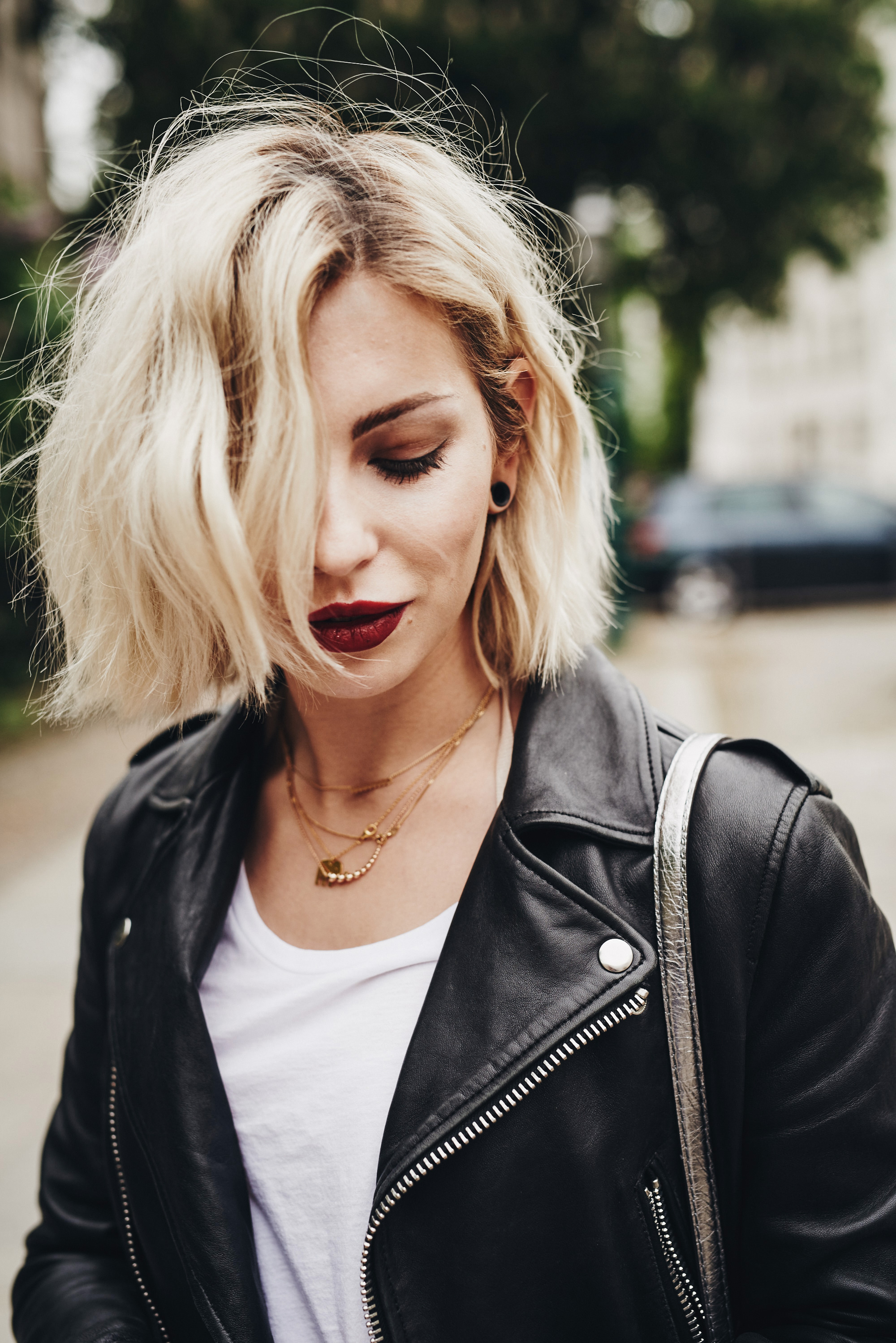 Jetzt wo ich wieder da bin, muss ich ziemlich viele Business Termine wahrnehmen und obwohl ich das total gerne mache, habe ich auch immer ein wenig Angst davor. Was nämlich offizielle Termine angeht, bin ich ganz besonders pingelig bei meiner Kleiderwahl und versuche mich immer irgendwo zwischen seriös und stylisch zu bewegen. Das hier ist dabei eins der Outfits (habe ich genauso in München getragen), die dabei herauskommen ein bisschen seriöser auszusehen ohne meine Identität zu verlieren und gleichzeitig meinem Fashionblogger-Ruf gerecht zu werden. Gar nicht so einfach! :D   Ich habe mich deswegen für eine graue Leinenhose (perfekt für den Sommer!) entschieden, die eigentlich ein Teil eines Zweiteilers ist und ein schlichtes weißes Shirt und eine Lederjacke. So weit, so basic. Die Highlights sind hier eindeutig die Schuhe und die Tasche, die durch das eher schlichte Outfit perfekt zur Geltung kommen.