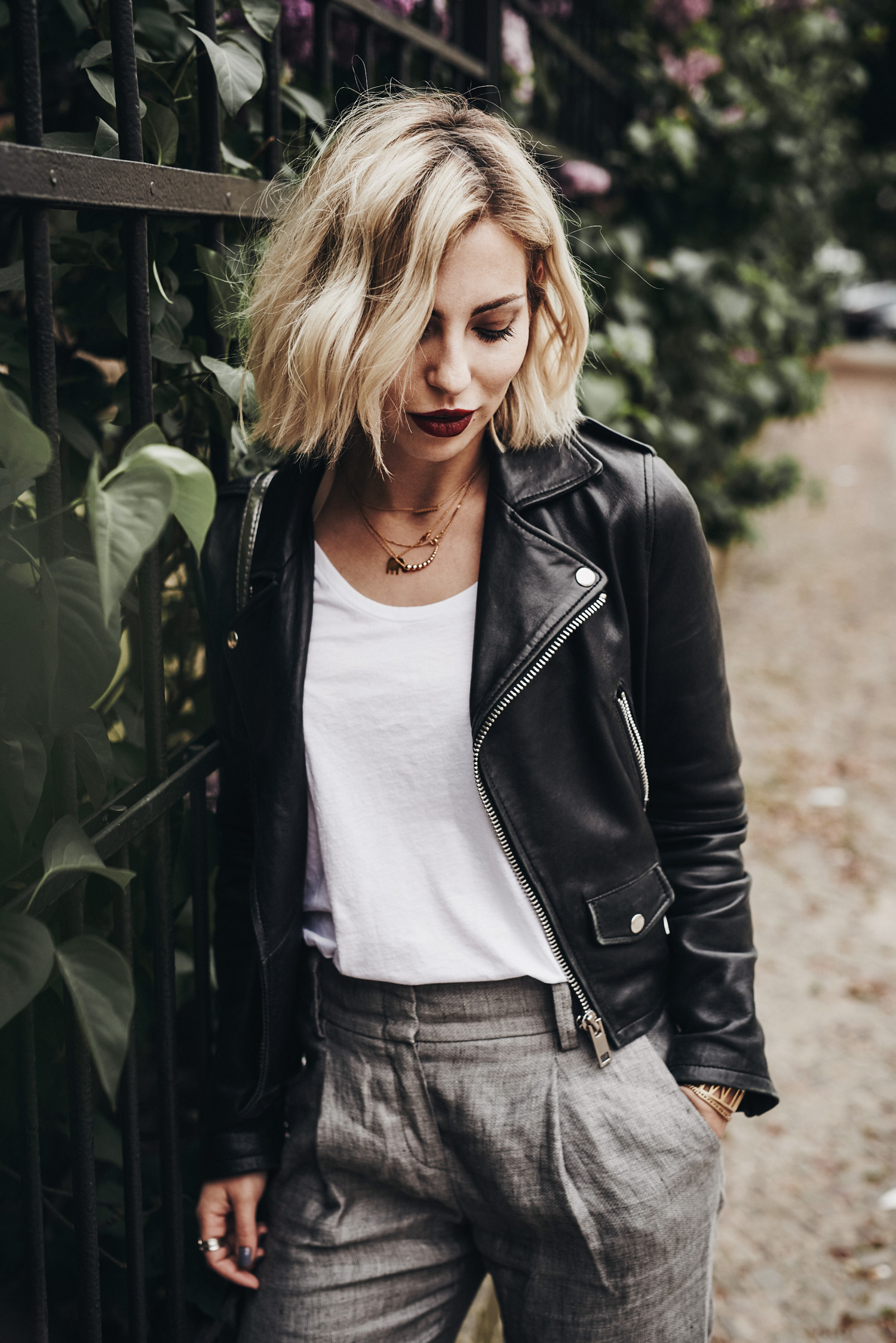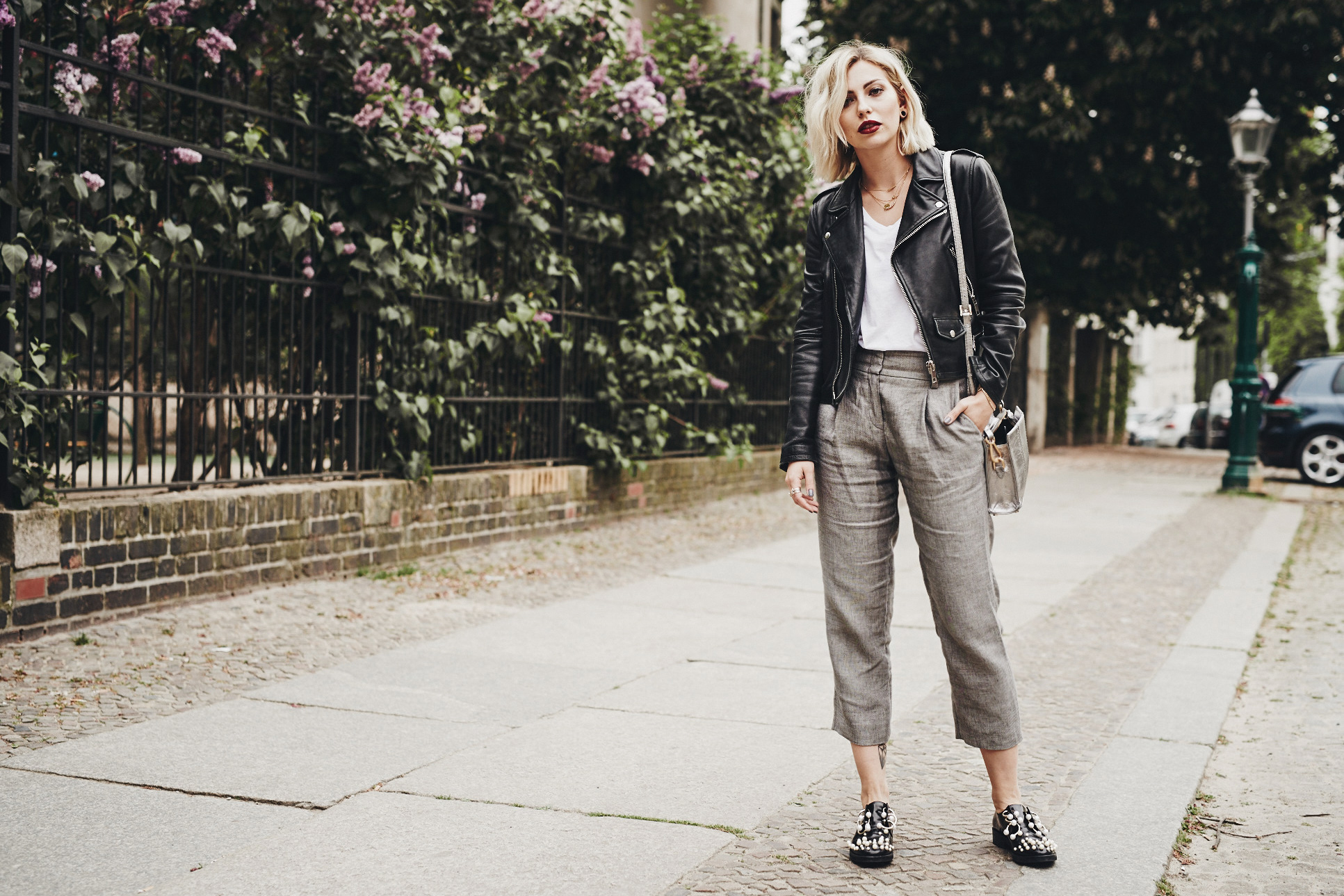 Итак, я снова в Берлине, и на этой неделе у меня запланировано довольно много деловых встреч. Для таких случаев я всегда особенно тщательно выбираю одежду и стараюсь, чтобы мой образ был серьезным и стильным одновременно. Мой сегодняшний образ – один из тех вариантов, которые дают мне возможность выглядеть более серьезной, чем обычно, сохраняя при этом мой индивидуальный стиль. Это не так-то просто :D   Поэтому я остановила свой выбор на серых полотняных брюках (идеальный вариант для лета!) в сочетании с простой белой футболкой и кожаной курткой. Определенную «изюминку» этому в целом довольно простому образу придают туфли и сумка.