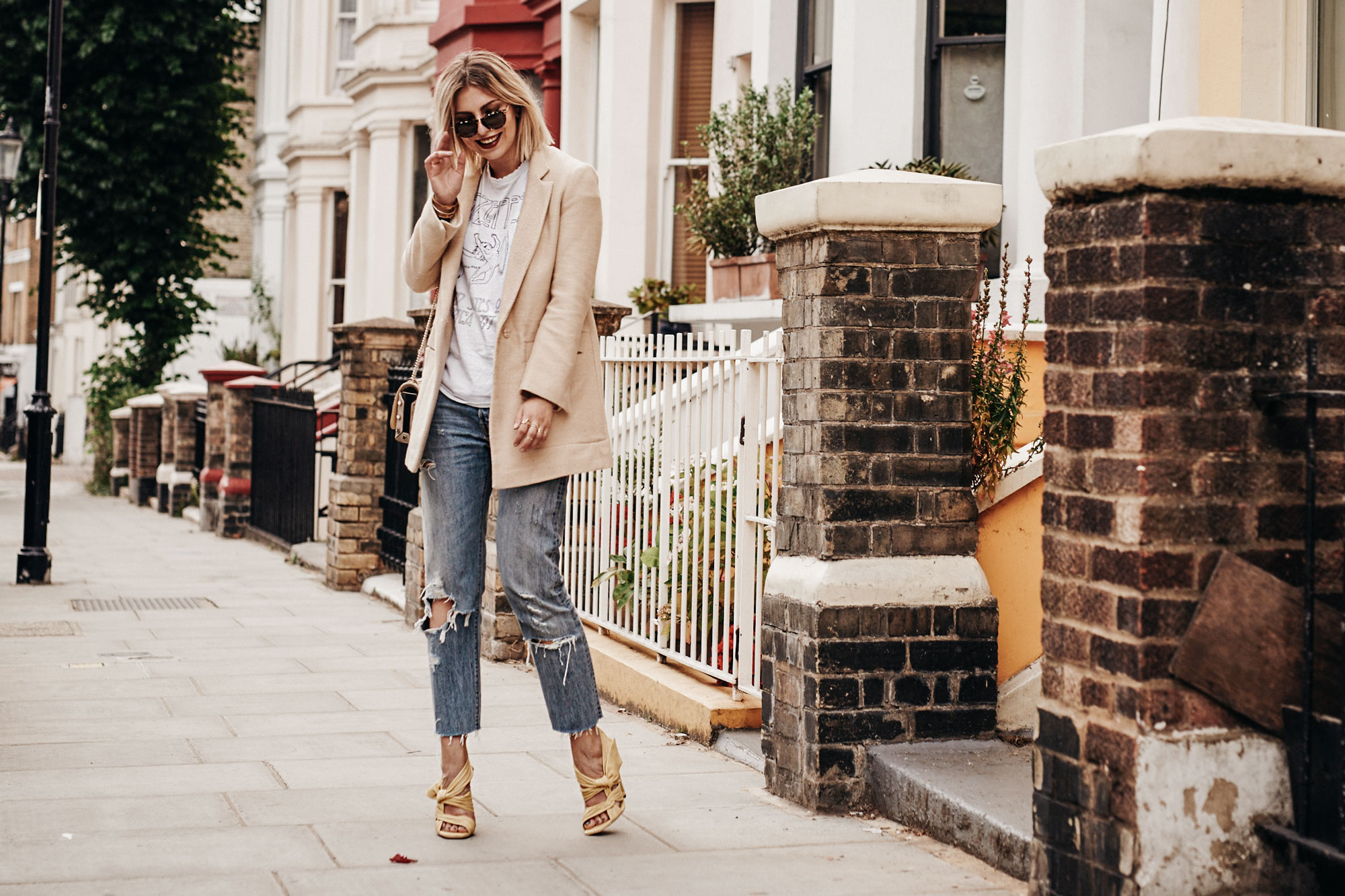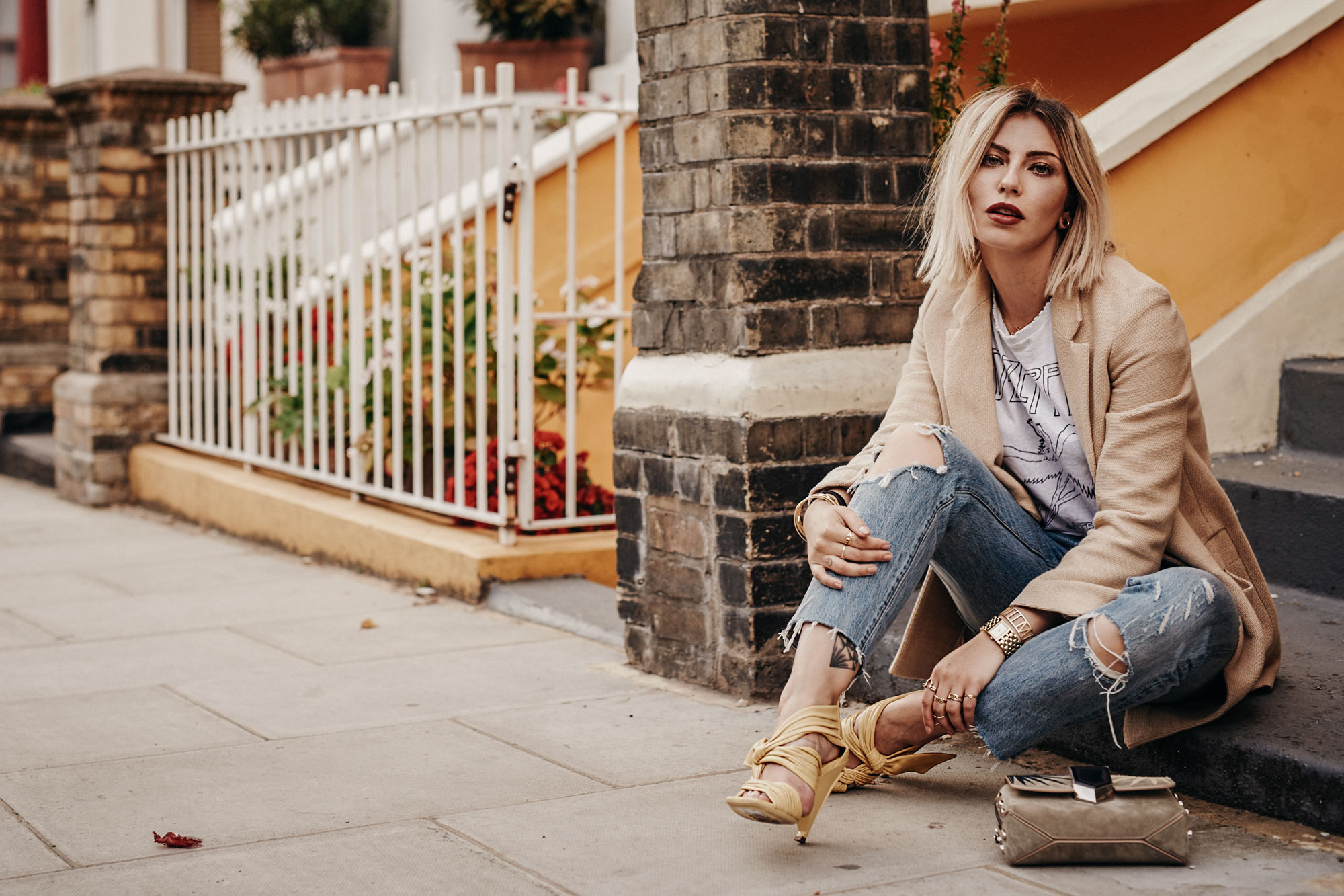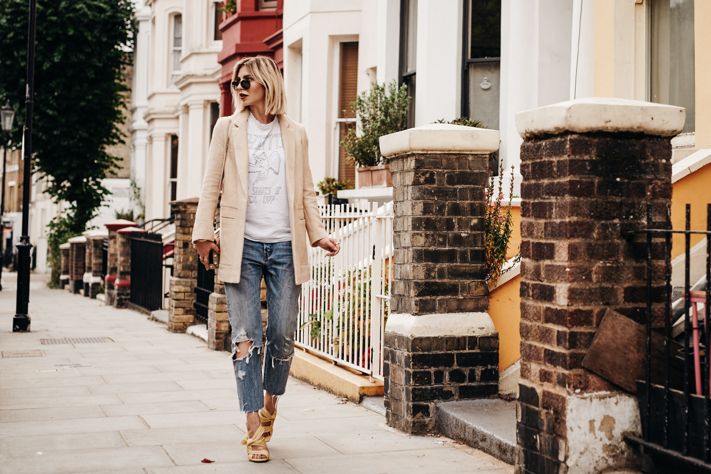 Passend zur Location habe ich mir mein Outfit ausgesucht, das ein bisschen sommerlich bunt ist, aber eben auch etwas von der Londoner Lässigkeit in sich trägt – und das ist meine Interpretation davon. Die gelben Sandalen und die Tasche schreien nach Sommer, die lässige Jeans und das Bandshirt der englischen Band Led Zeppelin dagegen bringen meine Londongefühle in Fahrt. Die Jacke rundet die Sache ab und schafft die Verbindung zwischen den London und den Sommerelementen.