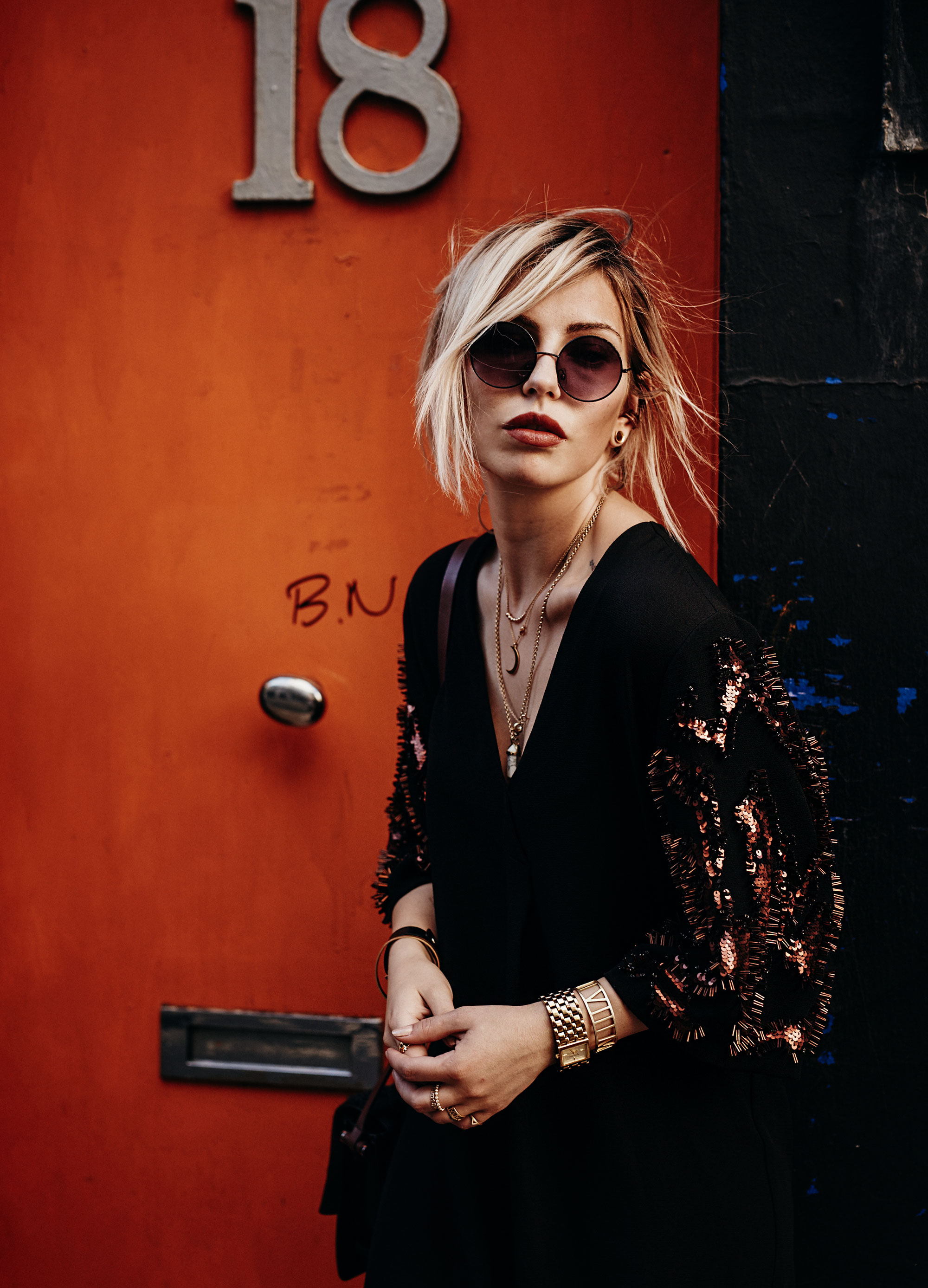 Wer besitzt es nicht? Das kleine Schwarze. Doch wie wäre es mal mit der der großen Schwester? Dem großen Schwarzen? Ich habe mich für ein Outfit mit einem nicht so ganz little black dress entschieden, das casual und ziemlich schick zugleich ist. Ehrlich gesagt finde ich, dass es ein bisschen was von einem Kartoffelsack hat, weil es sehr grade geschnitten ist, nur eben in schwarz und aus einem schönen fließenden Stoff. Doch bekanntlich sind es die Details, die den Unterschied machen, sowie die Pailettenärmel, die dem Kleid den gewissen Glamour geben, ohne dass es ‘too much’ ist, und der hohe Schlitz, der immer mal wieder ein begehrtes Stückchen Bein hervorblitzen lässt. Dass das Kleid aber nicht nur ideal für den Abend, sondern auch für den Tag gedacht ist, sieht man daran, wie gut es mit dem Parka harmoniert. Hach ja, hätten mir nicht nach wenigen Minuten die Füße wehgetan, so wäre ich aus dem Outfit vermutlich gar nicht mehr herausgeschlüpft!