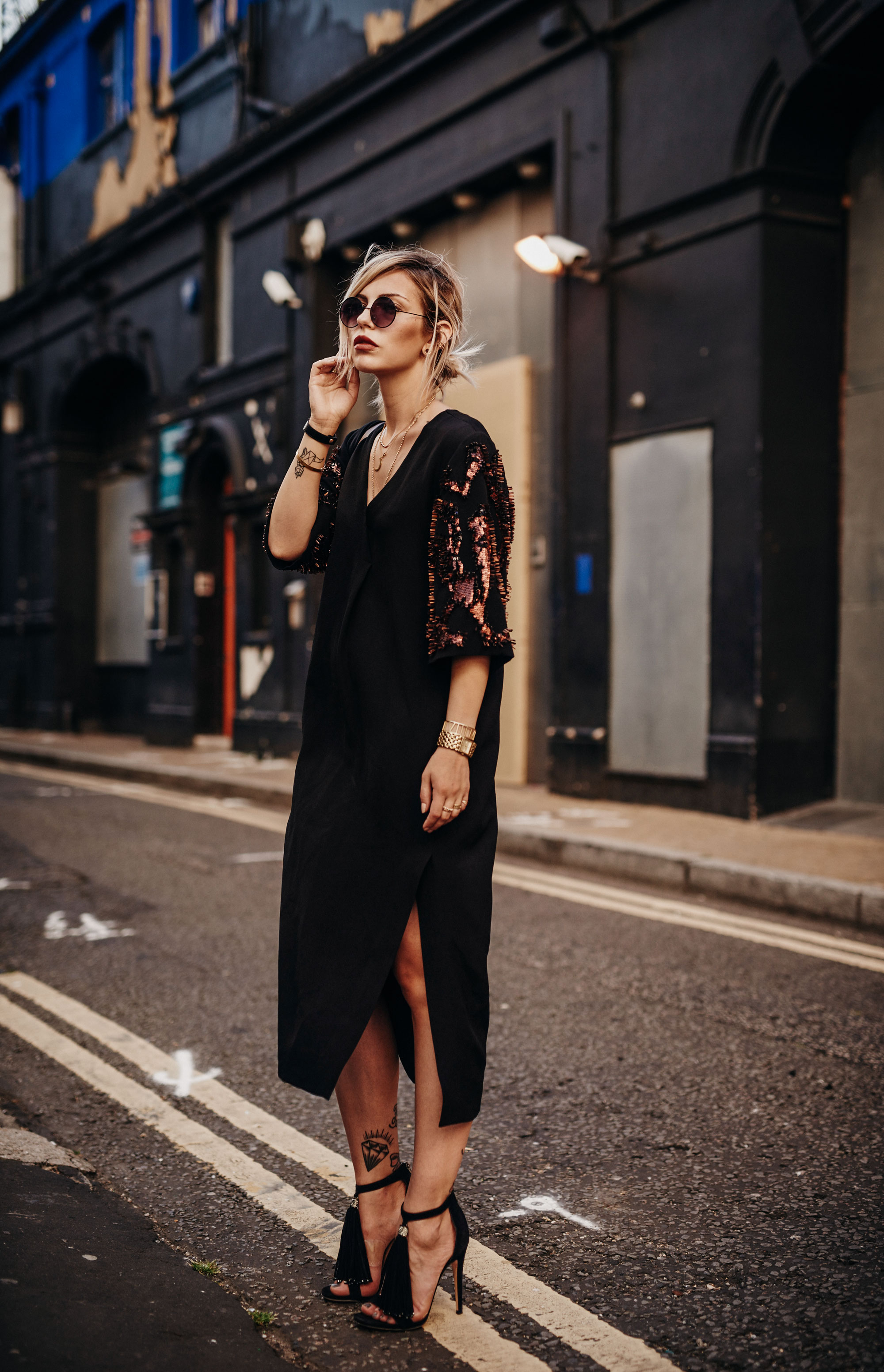 Who doesn’t have it? The little black dress. But how about the big sister? The big black dress? What I love about this outfit is that it’s casual, but chic at the same time. It’s oversized (more casual) but the sequins sleeves and the material make it really special. I think it’s perfect for every occasion. And it’s great with my new favorite jacket! But what I love most about this pictures is the perfect harmony between my outfit and the location we found in London. It’s just perfect!