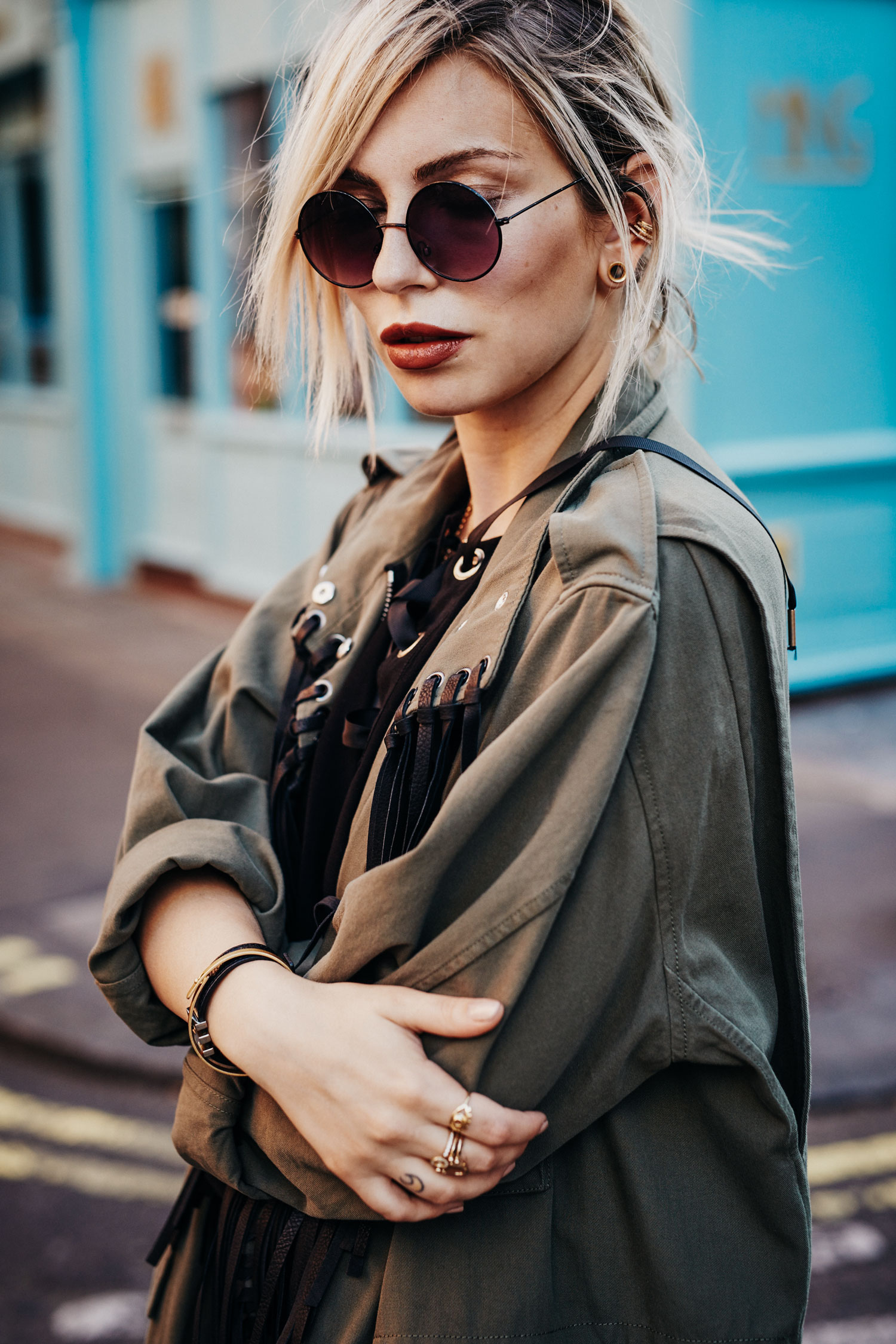 Die runde Brille setzt dem Ganzen noch ein bisschen Hippie auf – das ist viel Stil-Mischmasch (daneben noch Military, Mittelalterhemd-Schnürung, schicke Edel-Bommel-Rauleder-Heels und fetzige Tasche).