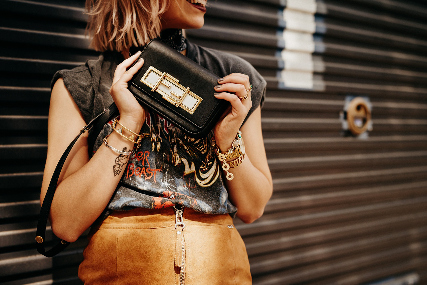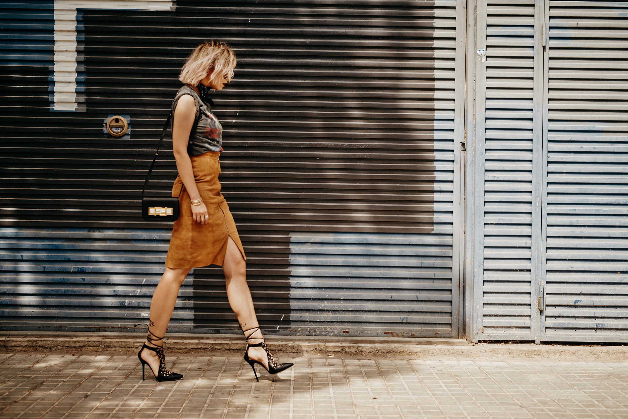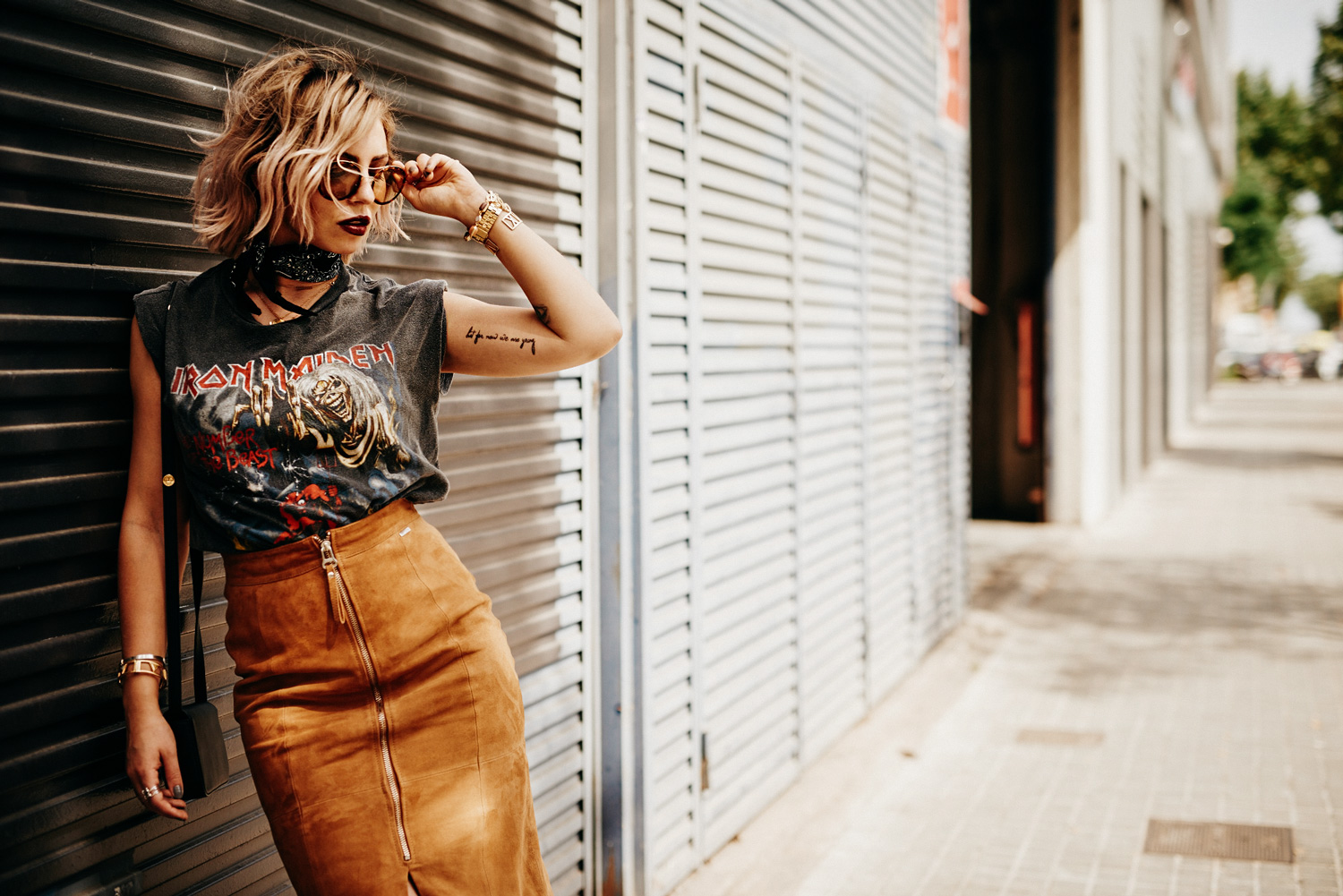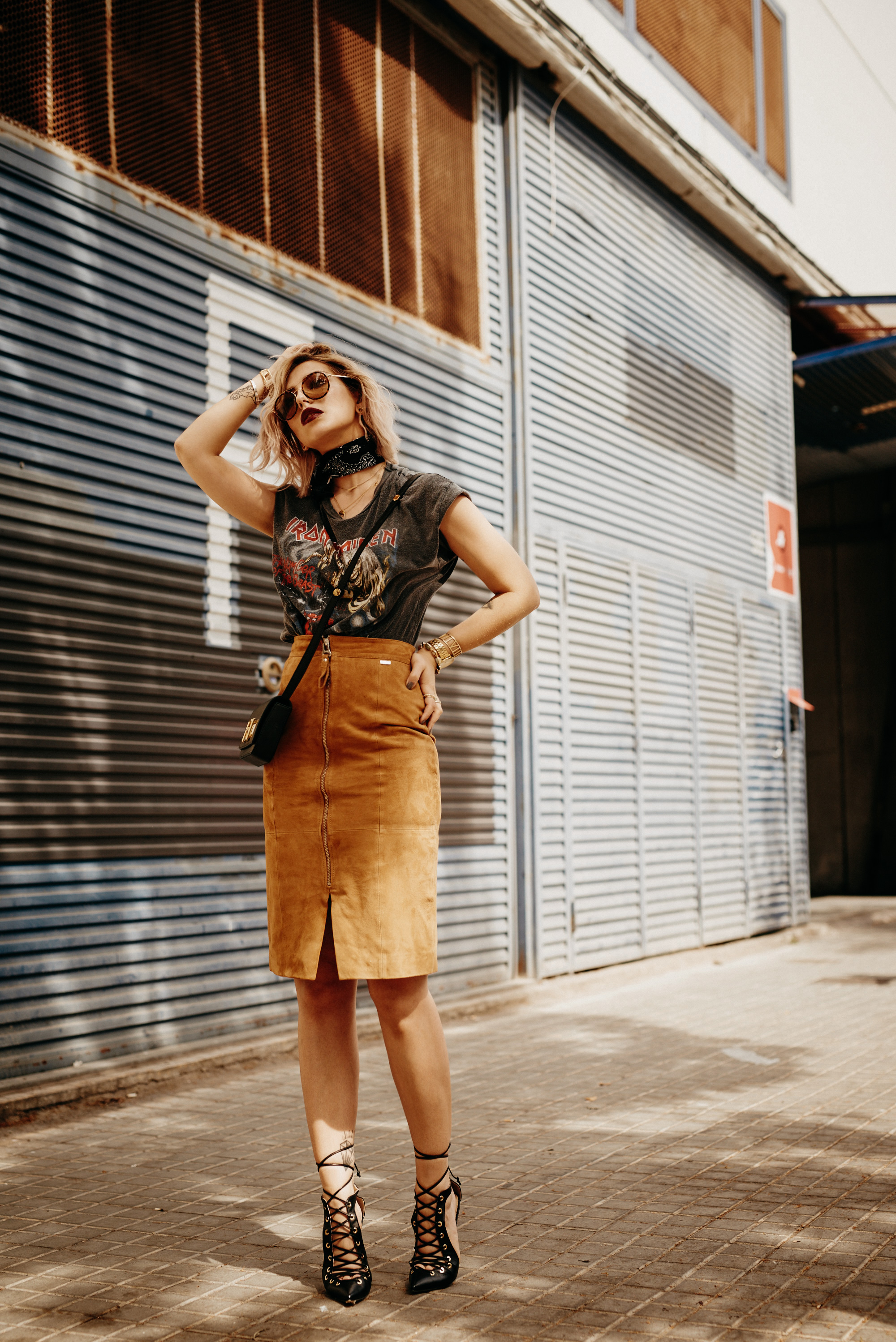 Another Monday – another outfit! This outfit is one of my favorite ones from Barcelona. I’m wearing my favorite band shirt, that I own for a few years now and a suede pencil skirt. I really like the contrast here. The outfit is grungy, but kinda chic at the same time.