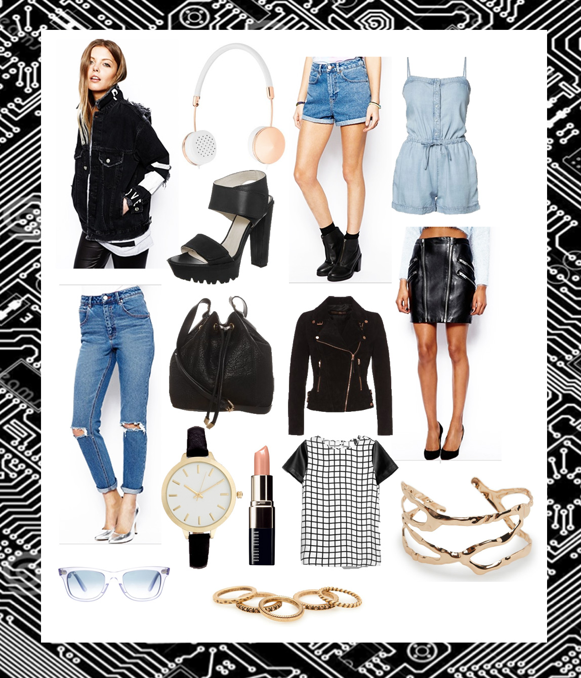 Frends Kopfhörer Sandalen Overall Lederjacke mit Kupferdetails Mom-Jeans Short Jeansjacke Tasche Lippenstift Sonnenbrille Shirt Uhr Armreif Ringe