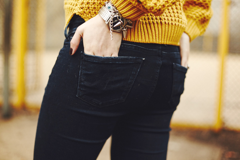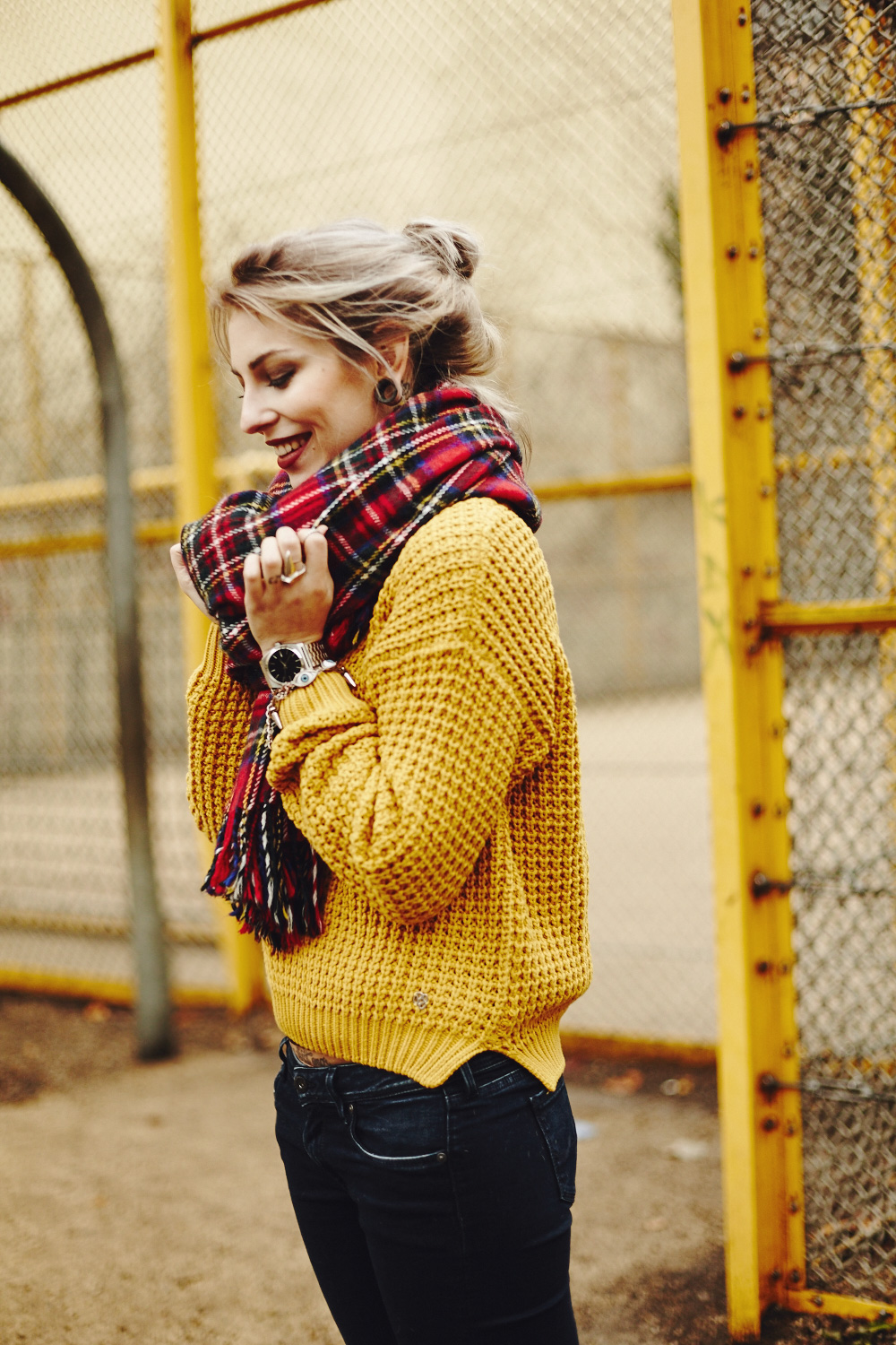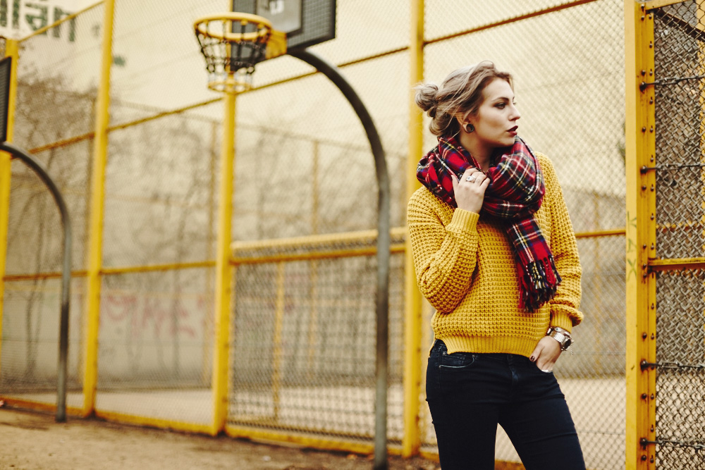 Ich trage ja echt nicht so oft Gelb (Farben generell…), finde die Farbe an sich aber total schön, insbesondere damals noch in Kombination mit den roten Haaren. Weil ich die aber nicht mehr habe muss eben ein roter Schal herhalten. Das gesamte Outfit ist recht sportlich gehalten, denn in letzter Zeit habe ich einfach gaaar keinen Bock auf hohe Schuhe und trage lieber Boots, Sneakers und einfach alles, was eine flache Sohle ist. Auf der Fashion Week in 2 Wochen werde ich noch genug Zeit haben mich aufzutakeln :)
